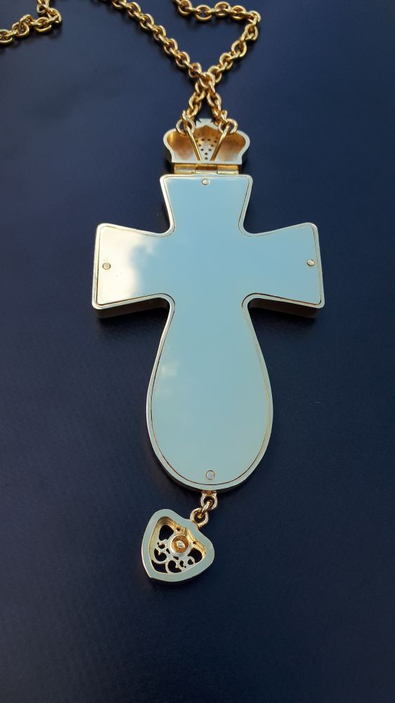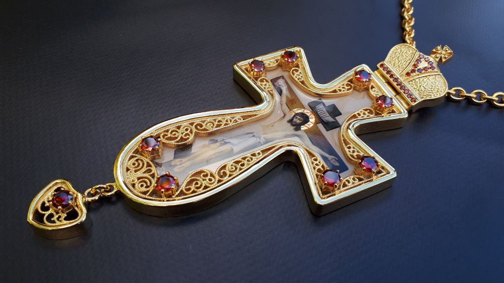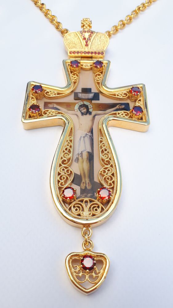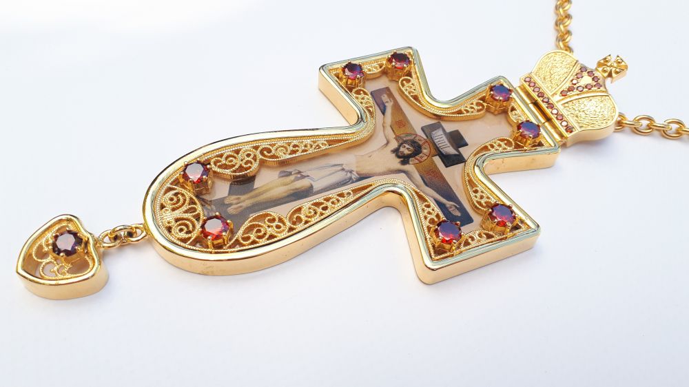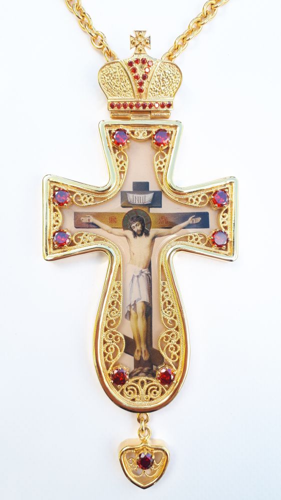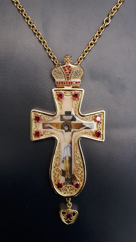 Хрест наперсний з літографією. Малюнок – якісний друк. Матеріал німба – золотиста фольга Розміри: 160х70 мм. Вага: 130 г. Позолочена латунь. Камені – цирконій. Ланцюг та футляр у комплекті. Можлива зміна кольору каміння, фону малюнка.