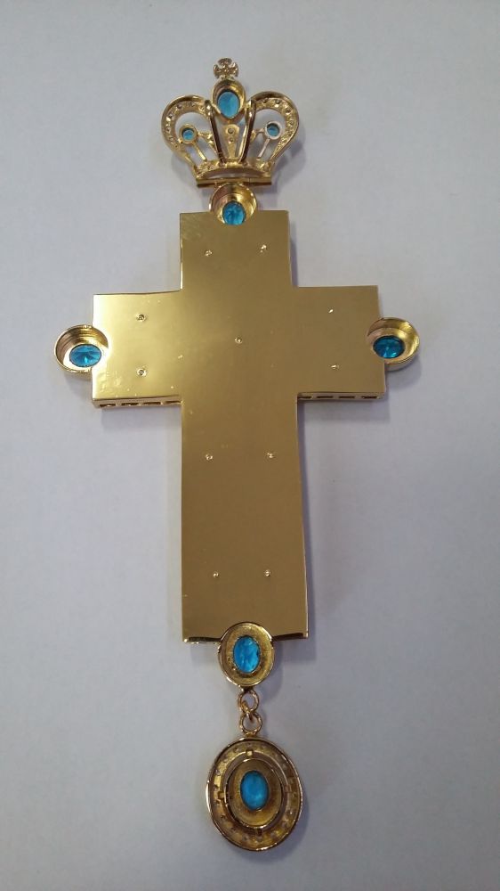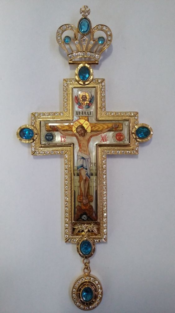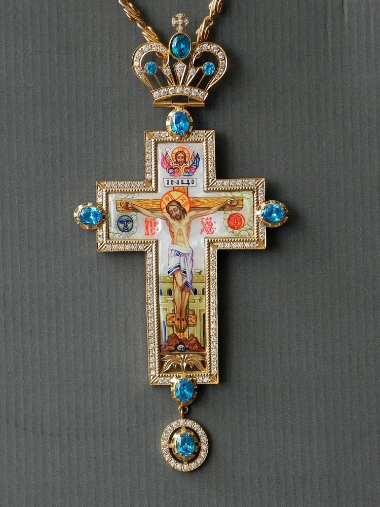 Хрест наперсний Розп'яття - ручний розпис на перламутрі. Розміри: 200х95 мм. Вага: 123 г. Позолочена латунь. Камені – цирконій. Колір каменів – блакитний. Ланцюг та футляр у комплекті Можлива зміна кольору каміння, малюнка, виготовлення хреста у сріблі.