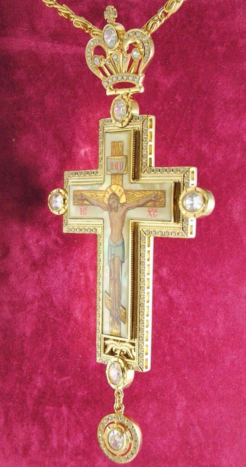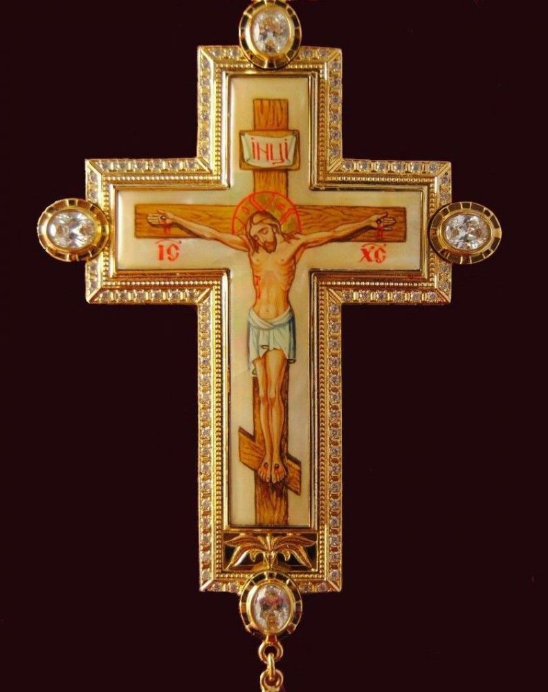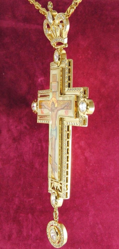 Крест наперсный. Распятие - ручная роспись на перламутре. Размеры: 200х95 мм. Вес: 123 г. Золоченая латунь. Камни - цирконий. Цепь и футляр в комплекте. Возможно изменение цвета камней, рисунка, изготовление креста в серебре.Крест наперсный