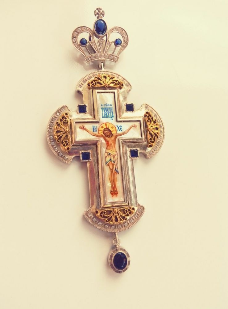 Хрест наперсний. Розп'яття – ручний розпис на перламутрі. Розміри: 165х80 мм. Вага: 140 г. Позолочена латунь. Камені – цирконій. Ланцюг та футляр у комплекті. Можлива зміна кольору каміння, малюнка, виготовлення хреста у сріблі.