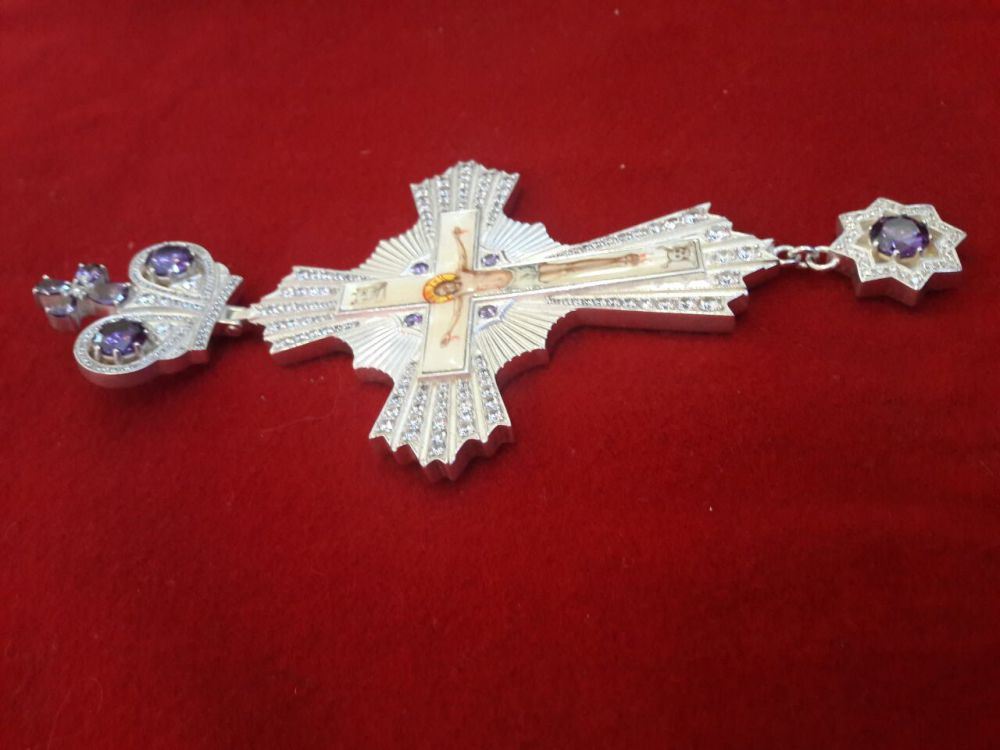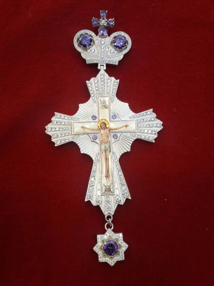 Хрест наперсний. Розп'яття – ручний розпис на перламутрі. Розміри: 190х90 мм. Вага:126 г. Посріблена латунь. Камені – цирконій. Ланцюг та футляр у комплекті. Можлива зміна кольору каміння, малюнка, виготовлення хреста у сріблі.
