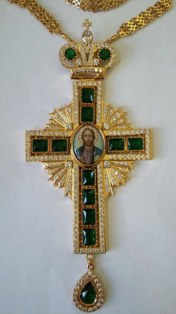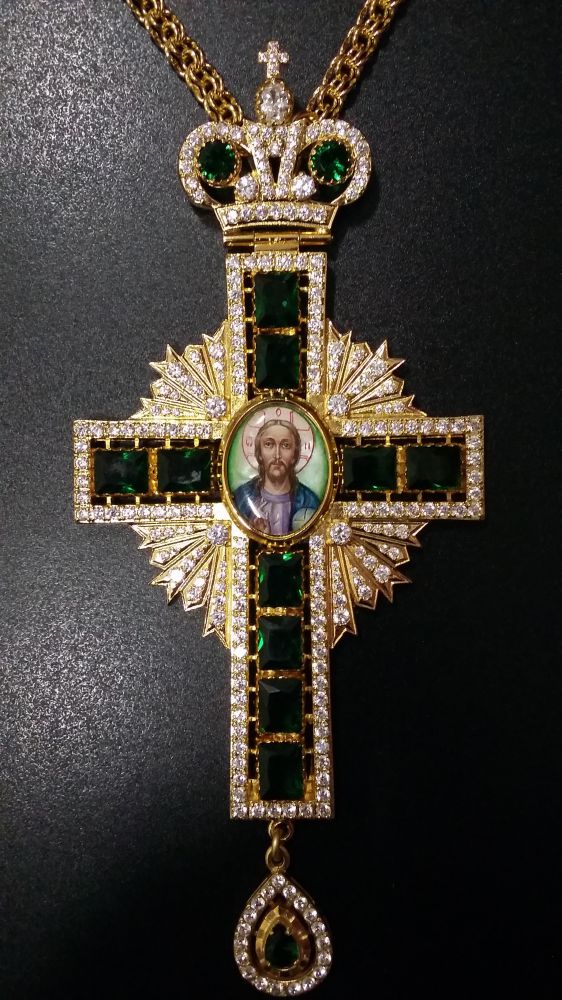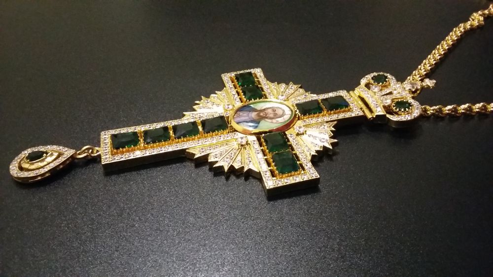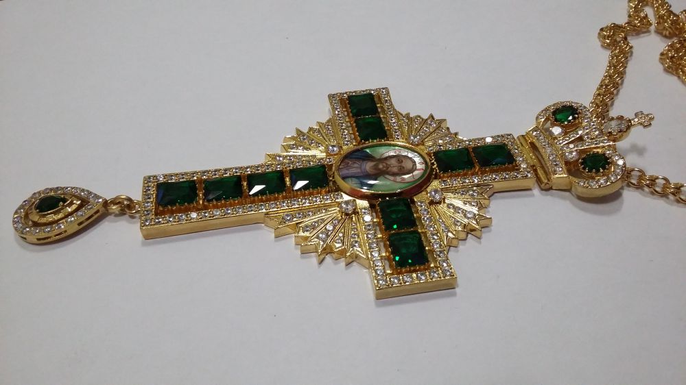 Хрест наперсний. Малюнок - ручний розпис на перламутрі. Розміри: 180х80 мм. Вага: 107 г. Позолочена латунь. Камені – цирконій. Ланцюг та футляр у комплекті. Можлива зміна кольору каміння, малюнка, виготовлення хреста у сріблі.