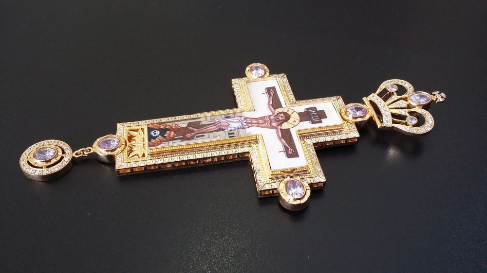 Крест наперсный. Распятие - ручная роспись на перламутре. Размеры: 200х95 мм. Вес: 123 г. Золоченая латунь. Камни - цирконий. Цвет камней - лаванда. Цепь и футляр в комплекте. Возможно изменение цвета камней, рисунка, изготовление креста в серебре.Крест наперсный.