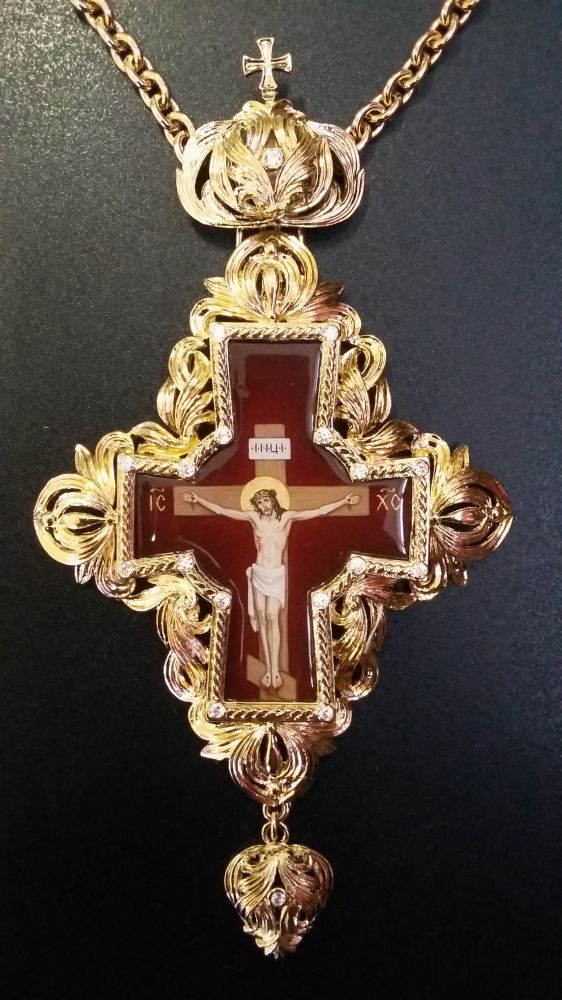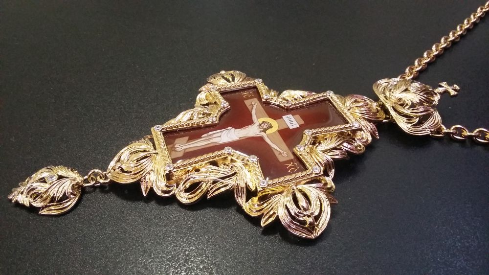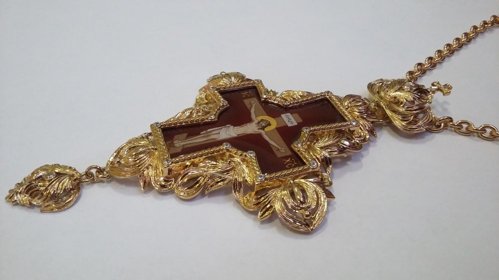 Хрест наперсний. Розп'яття - ручний розпис на металі. Розміри: 150х80 мм. Вага: 88 г. Позолочена латунь. Камені – цирконій. Ланцюг та футляр у комплекті. Можлива зміна кольору каміння, малюнка, виготовлення хреста у сріблі.