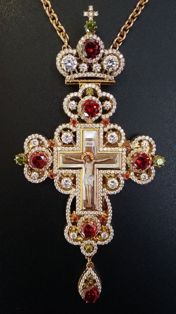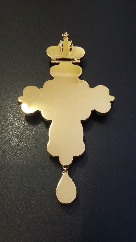 Хрест наперсний. Малюнок - ручний розпис на перламутрі. Розміри: 165х85 мм. Вага: 146 г. Позолочена латунь. Камені – цирконій. Ланцюг та футляр у комплекті. Можлива зміна кольору каміння, малюнка, виготовлення хреста у сріблі.