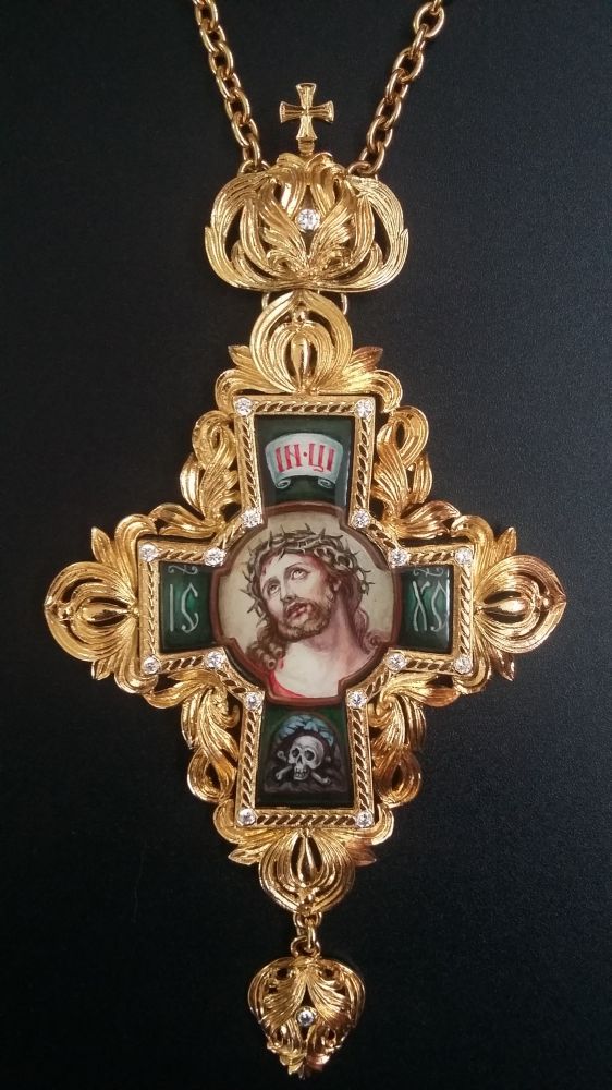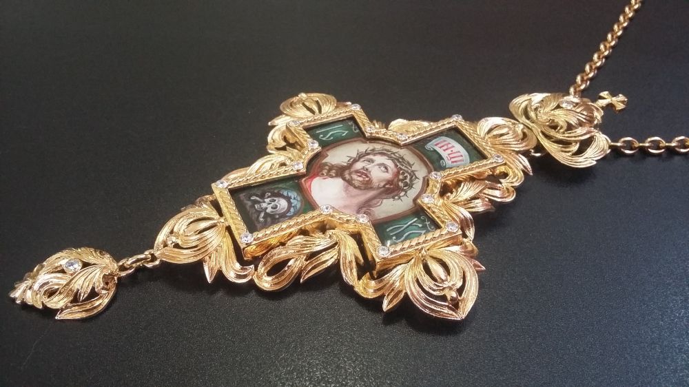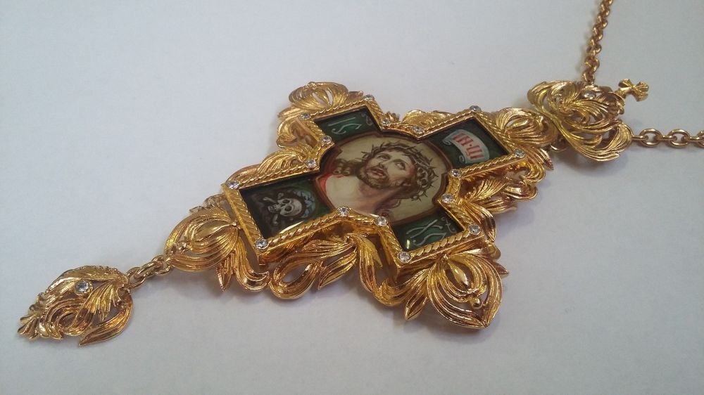 Хрест наперсний. Розп'яття – ручний розпис на металі. Розміри: 150х80 мм. Вага: 88 г. Позолочена латунь. Камені – цирконій. Ланцюг та футляр у комплекті. Можлива зміна кольору каміння, малюнка, виготовлення хреста у сріблі.