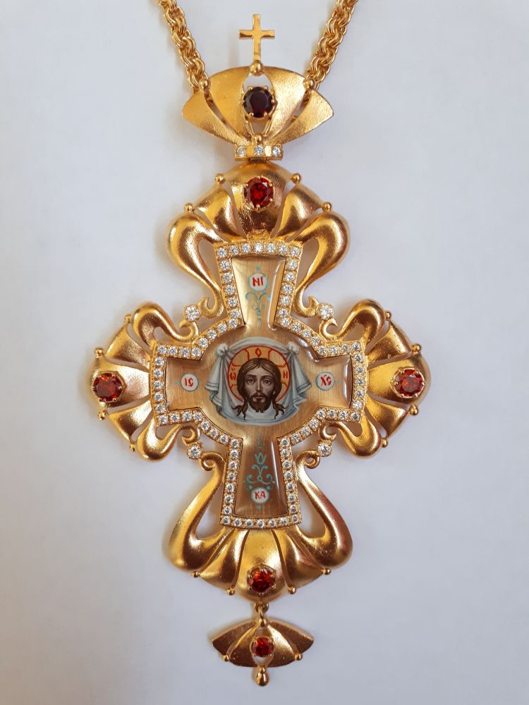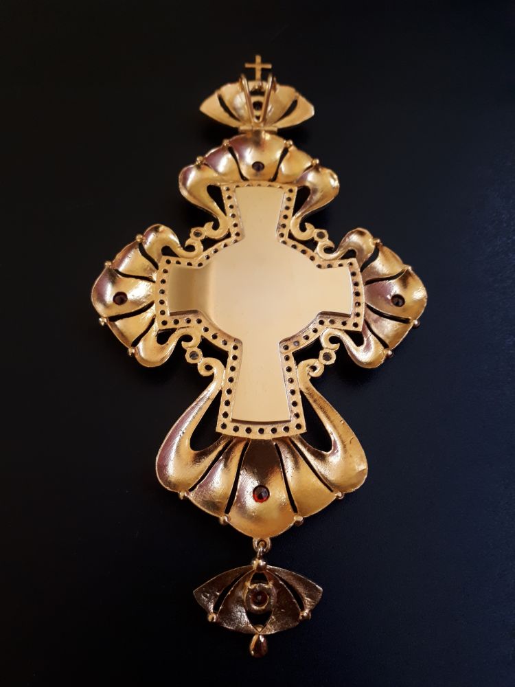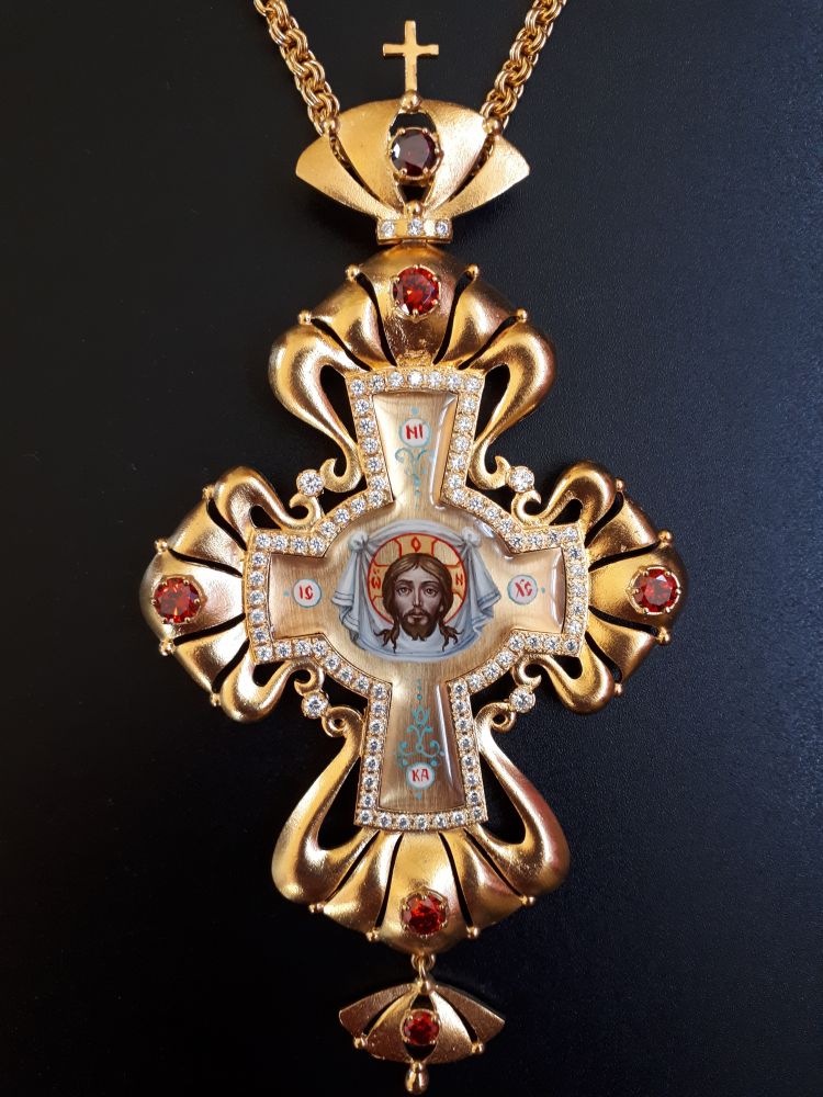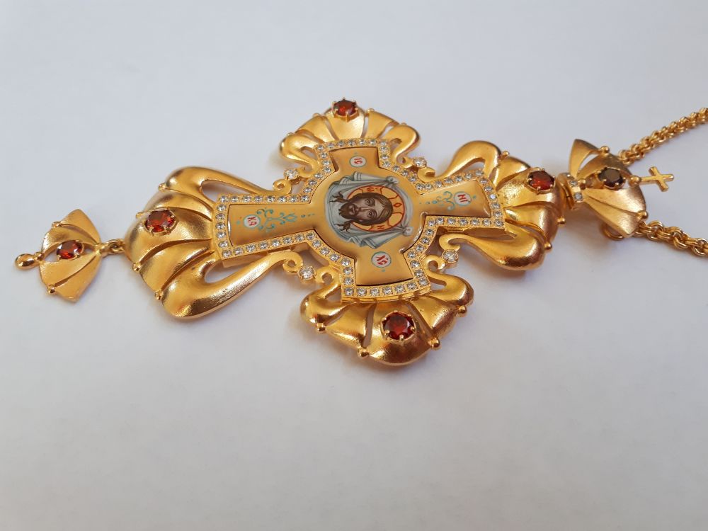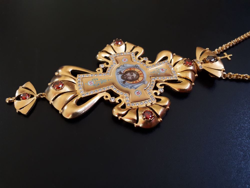 Хрест наперсний з ручним розписом. Розміри: 150 х 77 мм. Вага: 83 г. Лик - ручний розпис на металі. Позолочена латунь. Камені – цирконій. Ланцюг та футляр у комплекті. Можлива зміна кольору каміння, малюнка, виготовлення хреста у сріблі.