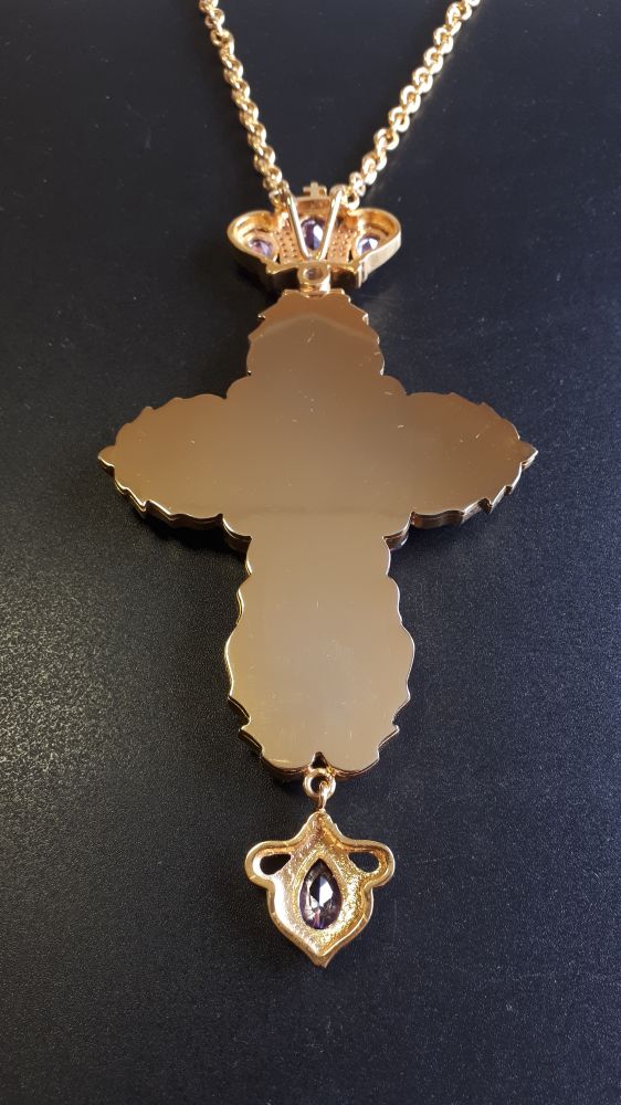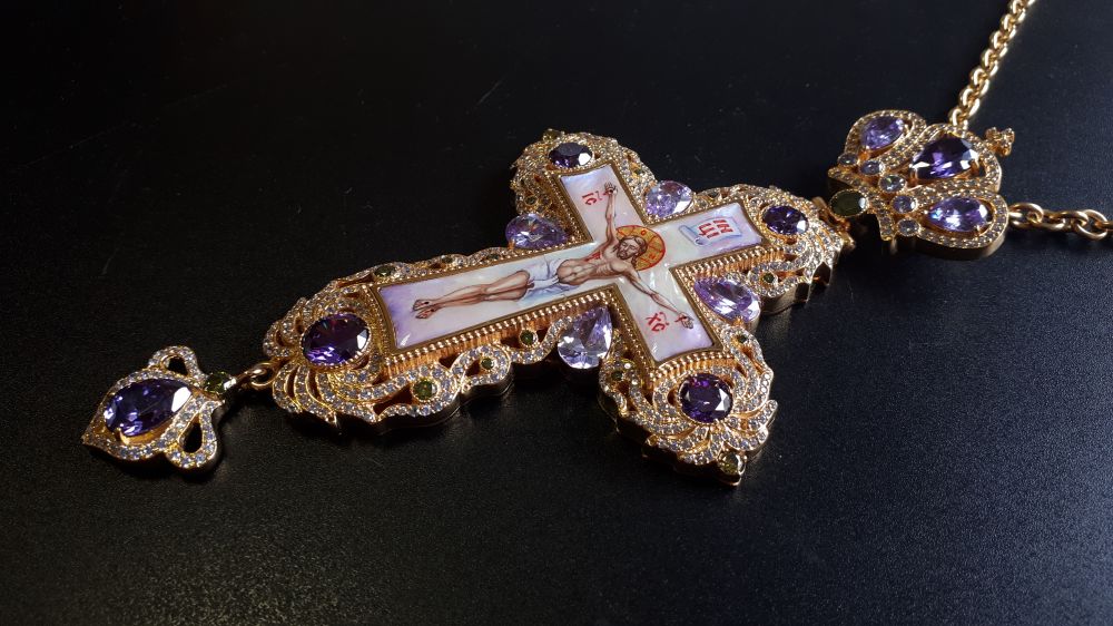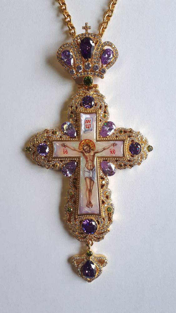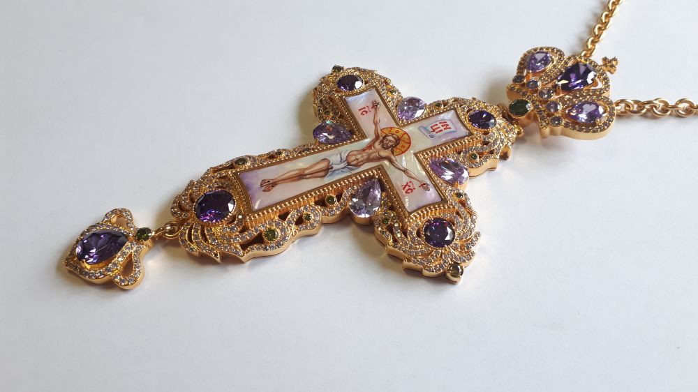 Хрест наперсний. Малюнок - ручний розпис на перламутрі. Розміри: 165х80 мм. Вага: 122 г. Позолочена латунь. Камені – цирконій. Ланцюг та футляр у комплекті. Можлива зміна кольору каміння, малюнка, виготовлення хреста у сріблі.