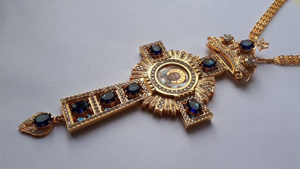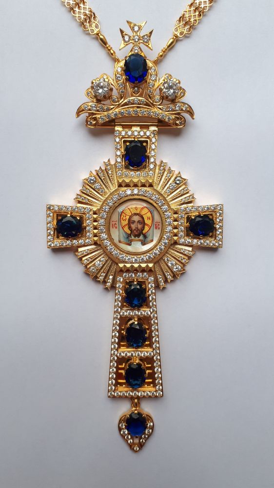 Крест наперсный. Овальные камни. Лик - ручная роспись на перламутре. Размеры: 185х80 мм. Вес: 133 г. Золоченая латунь. Камни - цирконий. Цепь и футляр в комплекте. Возможно изменение цвета камней, рисунка, изготовление креста в серебре.