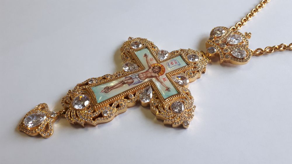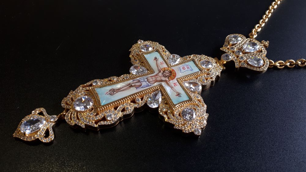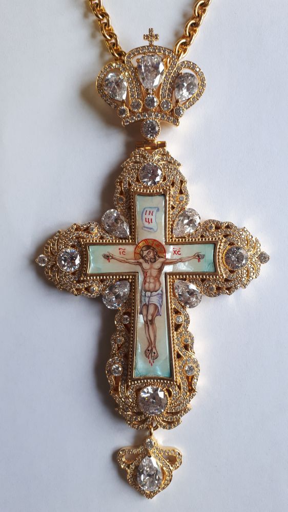 Хрест наперсний. Малюнок - ручний розпис на перламутрі. Розміри: 165х80 мм. Вага: 122 г. Позолочена латунь. Камені – цирконій. Ланцюг та футляр у комплекті. Можлива зміна кольору каміння, малюнка, виготовлення хреста у сріблі.