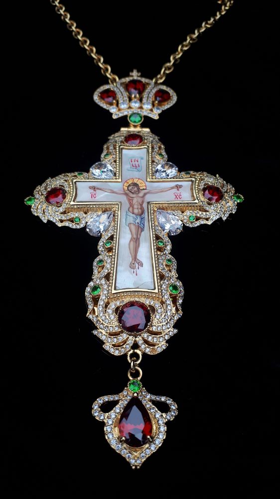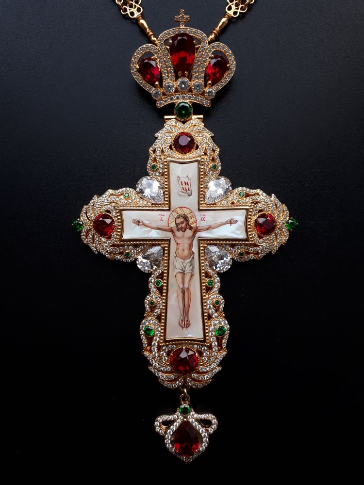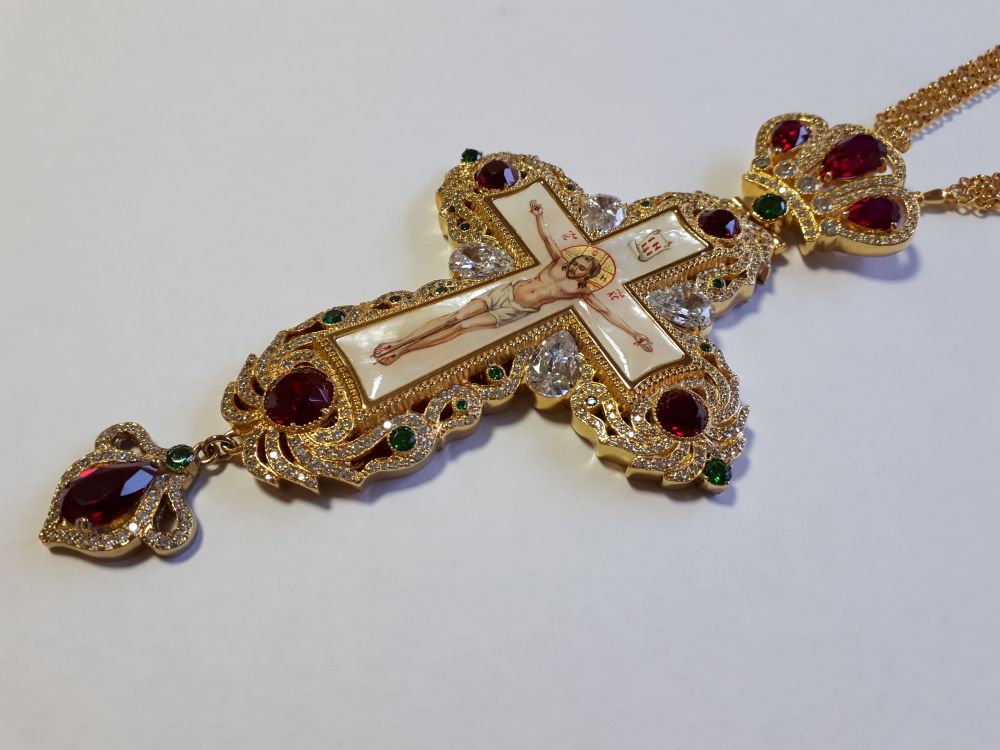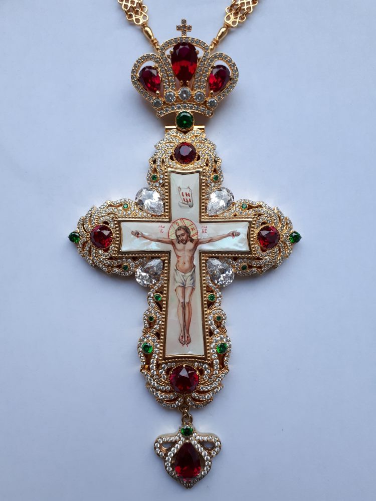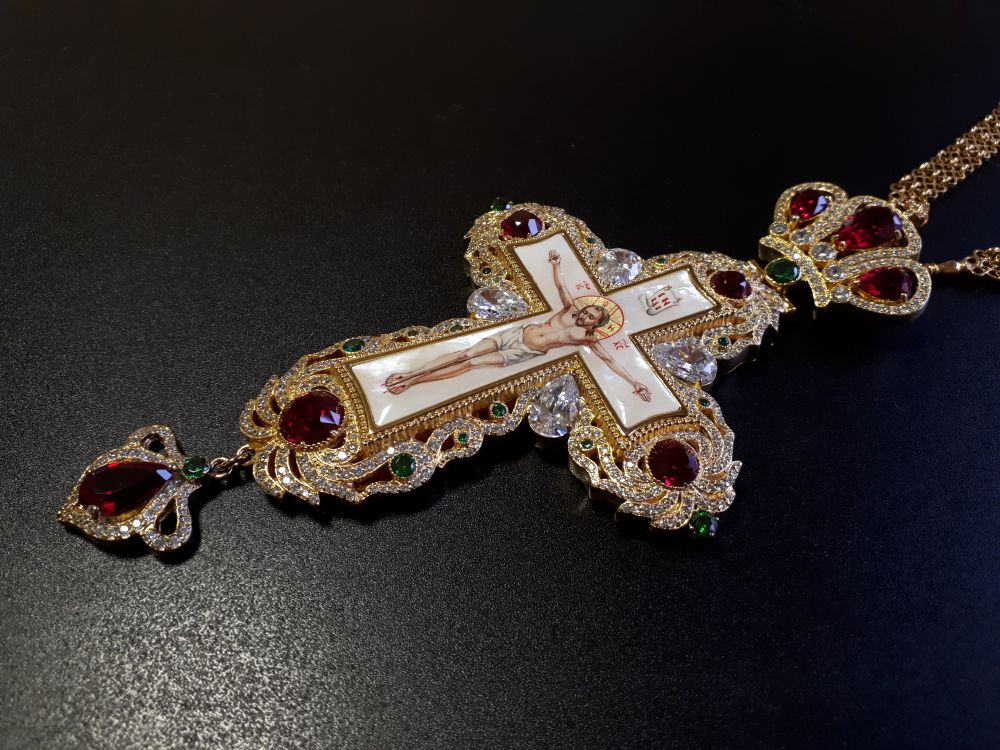 Хрест наперсний. Малюнок - ручний розпис на перламутрі. Розміри: 165х80 мм. Вага: 122 г. Позолочена латунь. Камені – цирконій. Ланцюг та футляр у комплекті. Можлива зміна кольору каміння, малюнка, виготовлення хреста у сріблі.