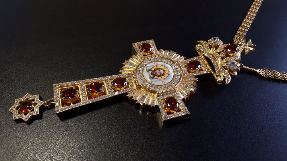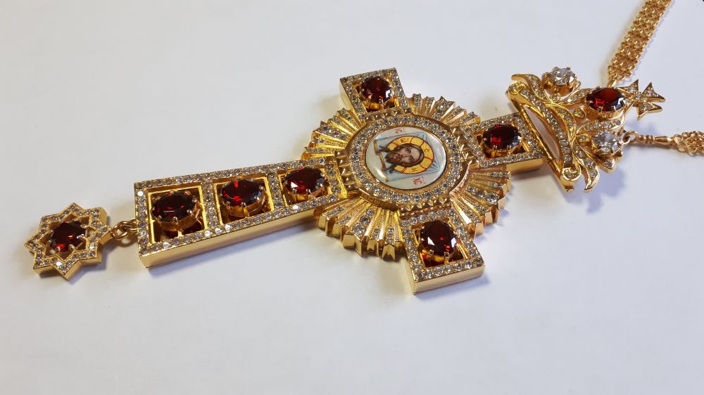 Крест наперсный. Овальные камни. Лик - ручная роспись на перламутре. Размеры: 185х80 мм. Вес: 133 г. Золоченая латунь. Камни - цирконий. Цепь и футляр в комплекте. Возможно изменение цвета камней, рисунка, изготовление креста в серебре.Крест наперсный. Овальные камни.
