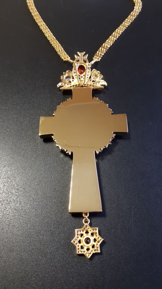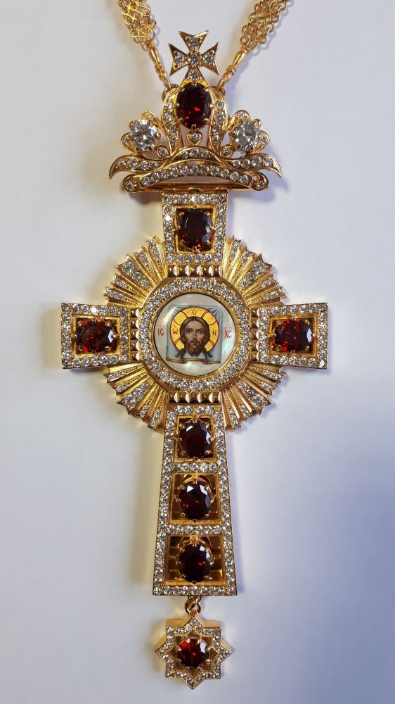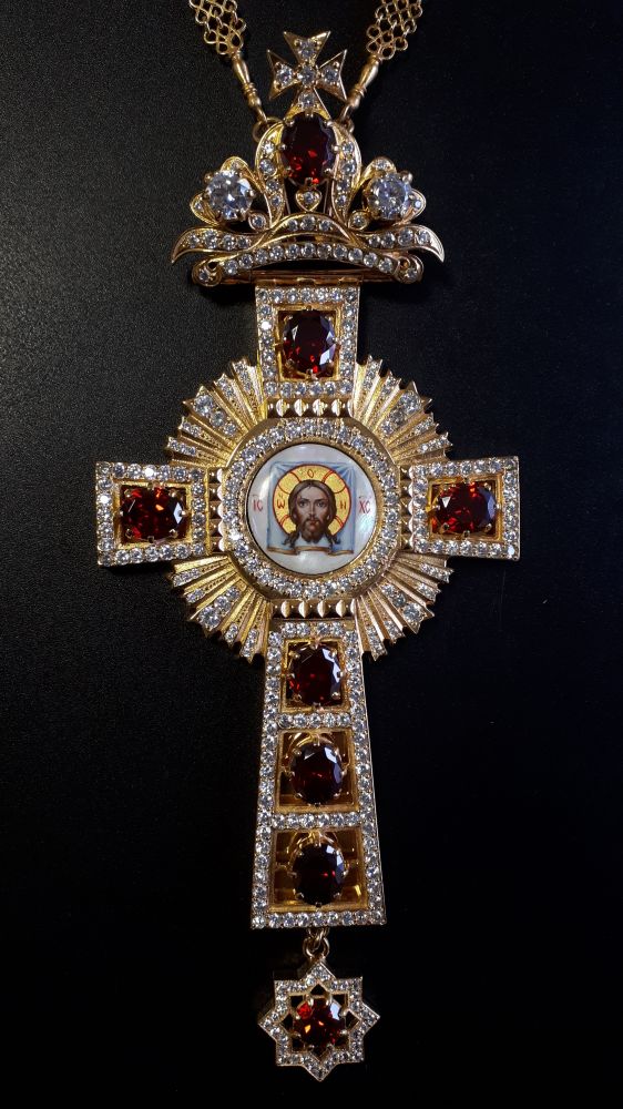Хрест наперсний. Овальне каміння. Лик - ручний розпис на перламутрі. Розміри: 185х80 мм. Вага: 133 г. Позолочена латунь. Камені – цирконій. Ланцюг та футляр у комплекті. Можлива зміна кольору каміння, малюнка, виготовлення хреста у сріблі.