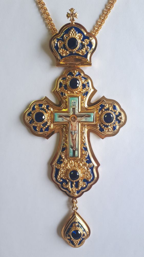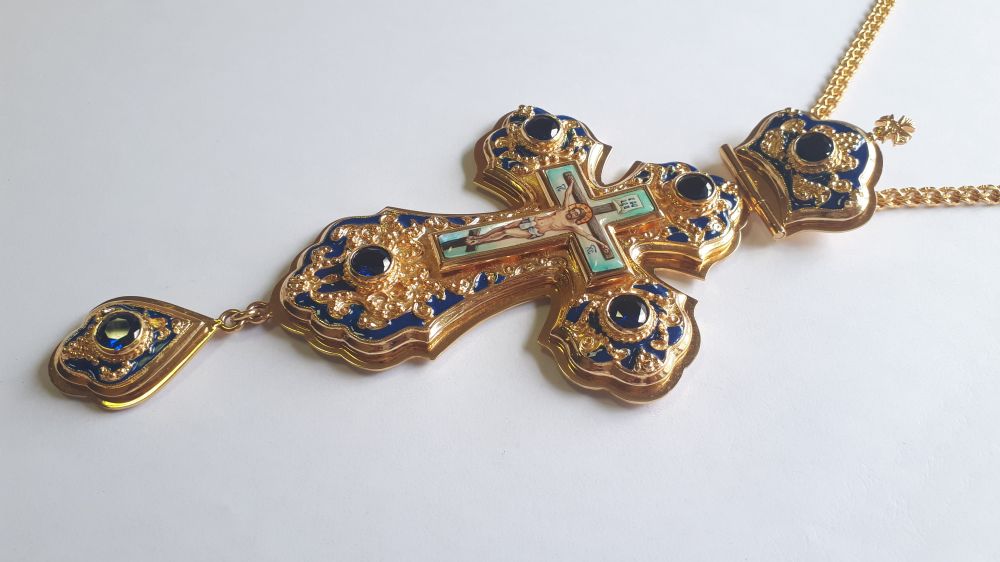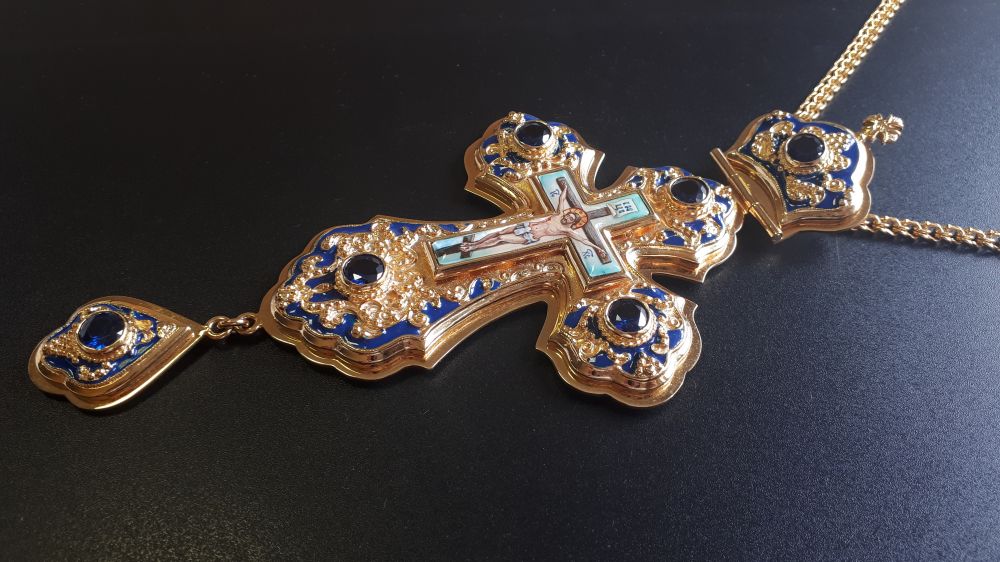 Крест наперсный. Рисунок - ручная роспись на перламутре. Синяя эмаль. Размеры: 185х80 мм. Вес: 146 г. Золоченая латунь. Камни - цирконий. Цепь и футляр в комплекте. Возможно изменение цвета камней, эмали, рисунка, изготовление креста в серебре.