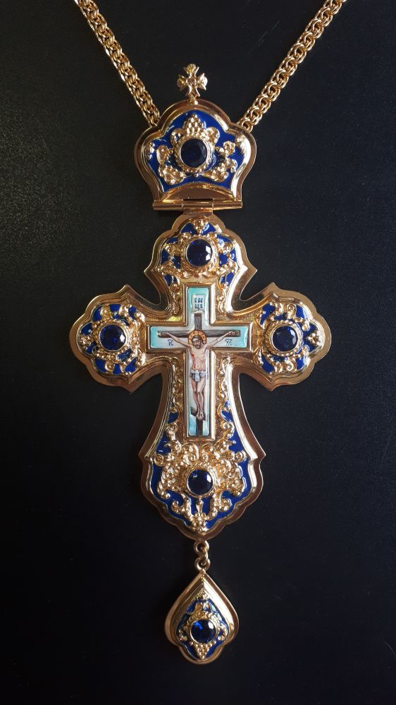 Хрест наперсний. Малюнок - ручний розпис на перламутрі. Синя емаль. Розміри: 185х80 мм. Вага: 146 г. Позолочена латунь. Камені – цирконій. Ланцюг та футляр у комплекті. Можлива зміна кольору каміння, емалі, малюнка, виготовлення хреста у сріблі.