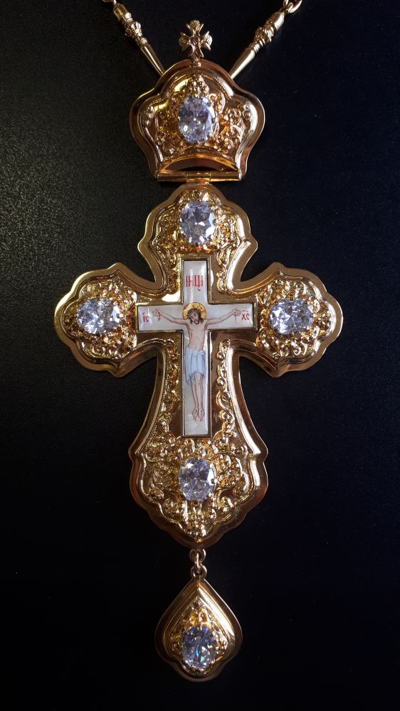 Крест наперсный. Рисунок - ручная роспись на перламутре. Размеры: 185х80 мм. Вес: 146 г. Золоченая латунь. Камни - цирконий. Цепь и футляр в комплекте. Возможно изменение цвета камней, рисунка, изготовление креста в серебре.