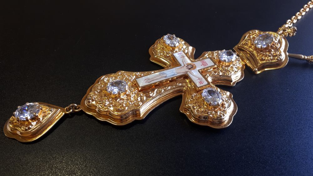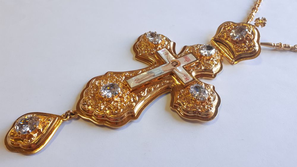 Хрест наперсний. Малюнок - ручний розпис на перламутрі. Розміри: 185х80 мм. Вага: 146 г. Позолочена латунь. Камені – цирконій. Ланцюг та футляр у комплекті. Можлива зміна кольору каміння, малюнка, виготовлення хреста у сріблі.