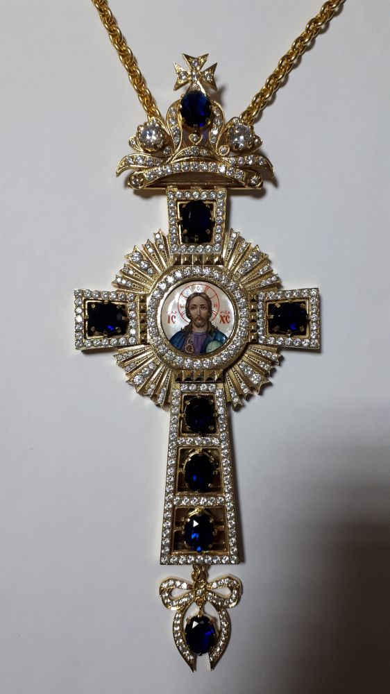 Крест наперсный. Овальные камни. Лик - ручная роспись на перламутре. Размеры: 185х80 мм. Вес: 133 г. Золоченая латунь. Камни - цирконий. Цепь и футляр в комплекте. Возможно изменение цвета камней, рисунка, изготовление креста в серебре.