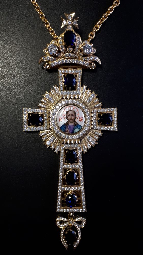 Хрест наперсний. Овальне каміння. Лик - ручний розпис на перламутрі. Розміри: 185х80 мм. Вага: 133 г. Позолочена латунь. Камені – цирконій. Ланцюг та футляр у комплекті. Можлива зміна кольору каміння, малюнка, виготовлення хреста у сріблі.