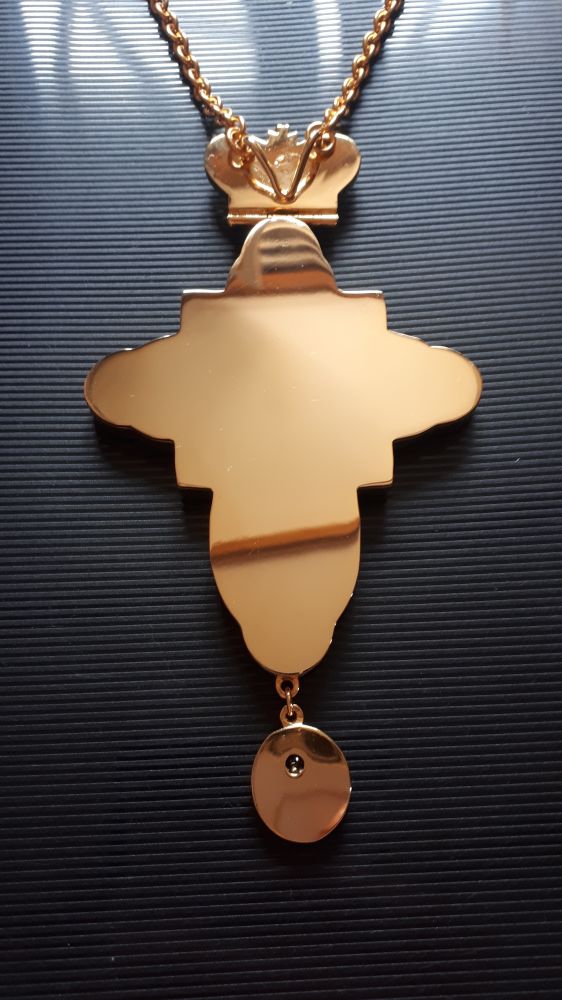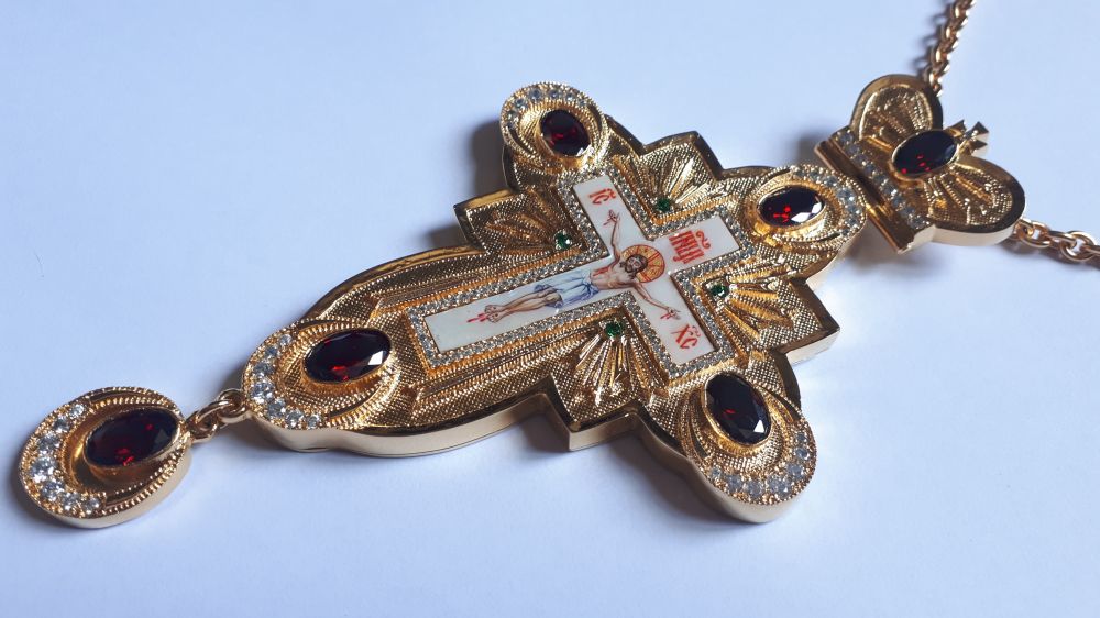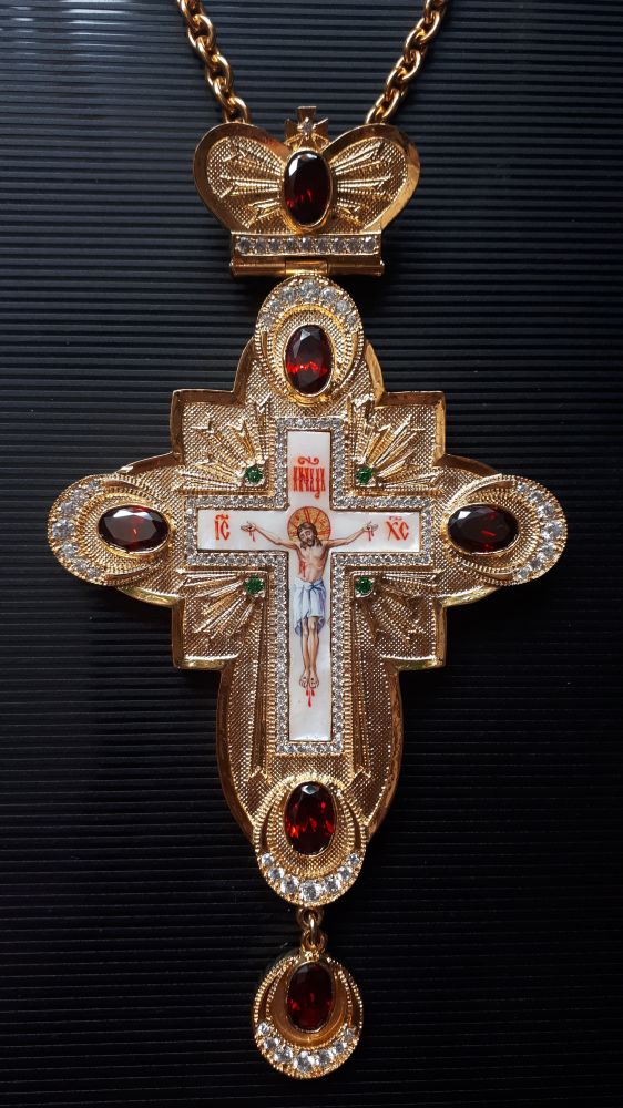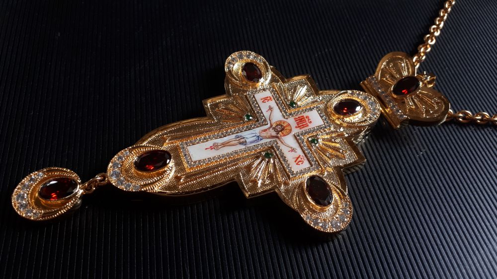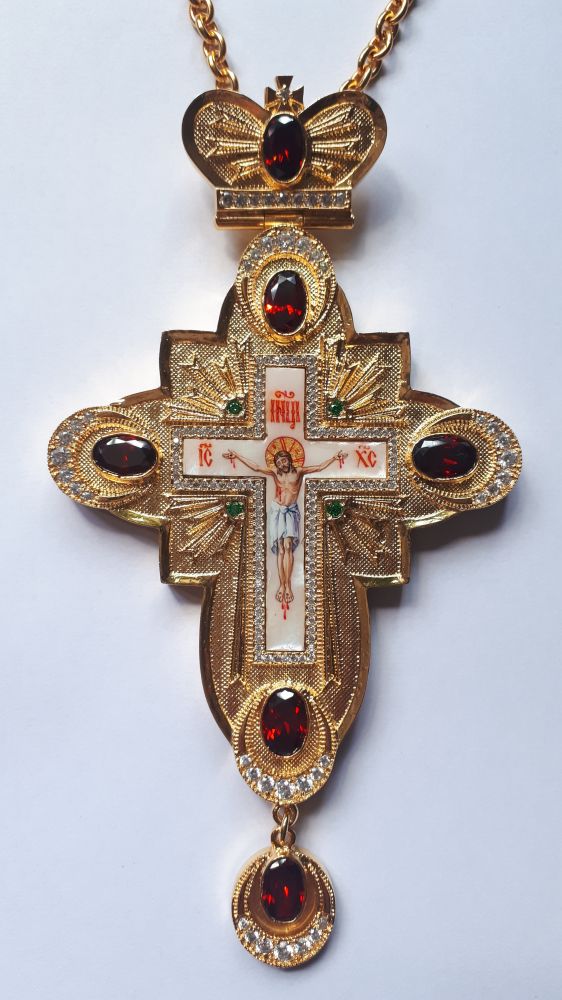 Хрест наперсний. Малюнок - ручний розпис на перламутрі. Розміри: 165 х 90 мм. Вага: 150 г. Позолочена латунь. Камені – цирконій. Ланцюг та футляр у комплекті. Можлива зміна кольору каміння, малюнка, виготовлення хреста у сріблі.