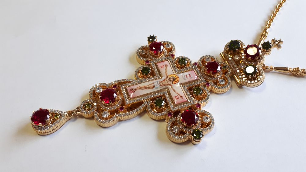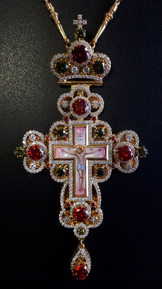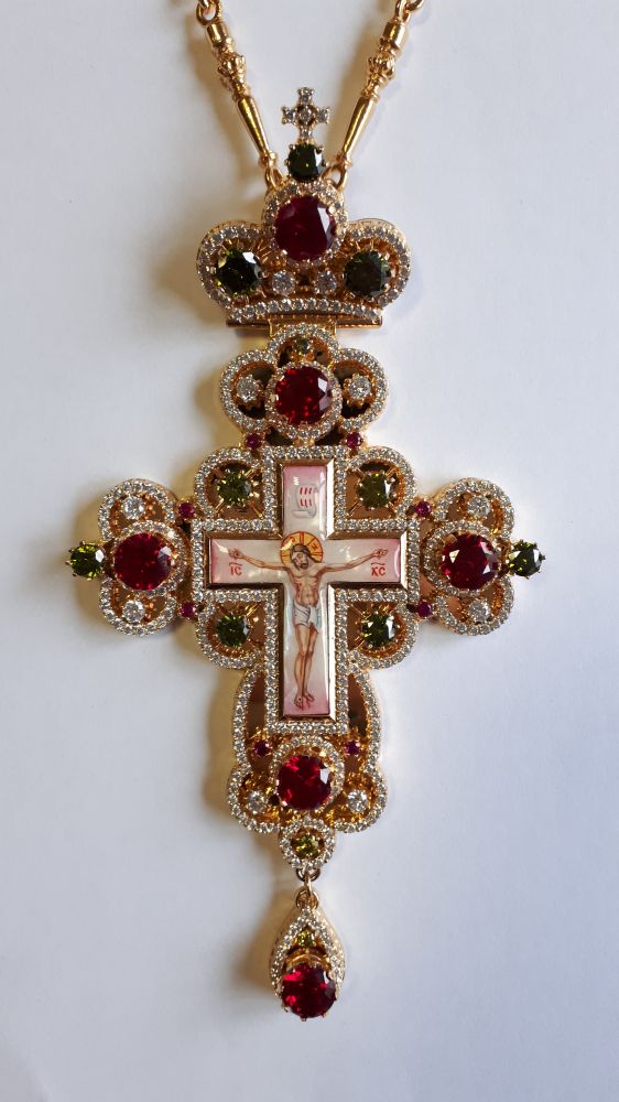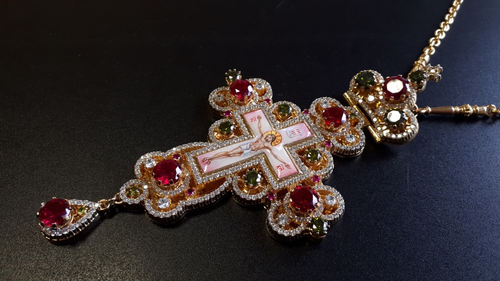 Хрест наперсний. Малюнок - ручний розпис на перламутрі. Розміри: 165х85 мм. Вага: 146 г. Позолочена латунь. Камені – цирконій. Ланцюг та футляр у комплекті. Можлива зміна кольору каміння, малюнка, виготовлення хреста у сріблі.