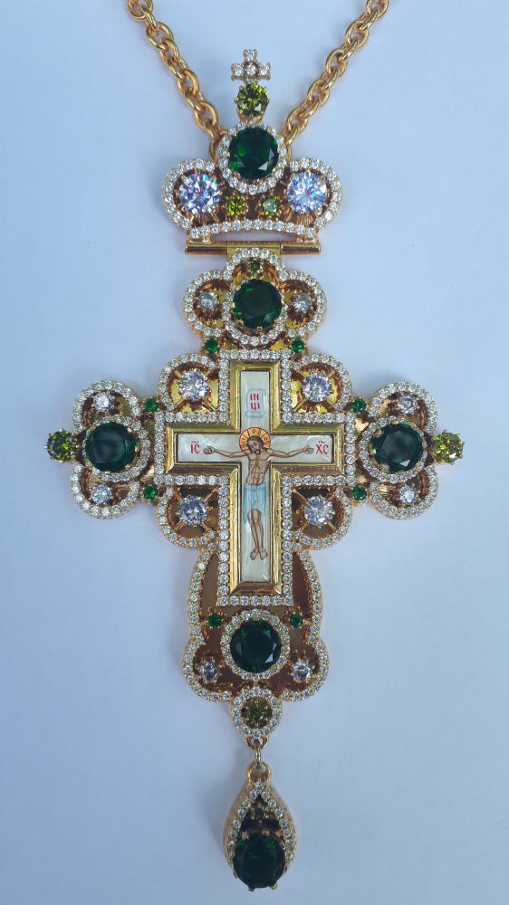 Крест наперсный. Рисунок - ручная роспись на перламутре. Размеры: 165х85 мм. Вес: 146 г. Золоченая латунь. Камни - цирконий. Цепь и футляр в комплекте. Возможно изменение цвета камней, рисунка, изготовление креста в серебре.