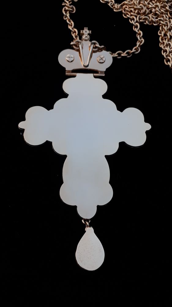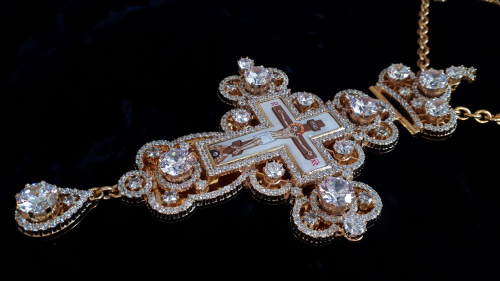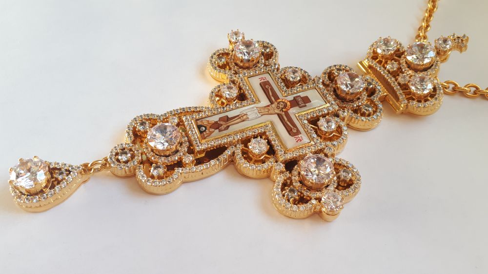 Хрест наперсний. Малюнок - ручний розпис на перламутрі. Розміри: 165х85 мм. Вага: 146 г. Позолочена латунь. Камені – цирконій. Ланцюг та футляр у комплекті. Можлива зміна кольору каміння, малюнка, виготовлення хреста у сріблі.