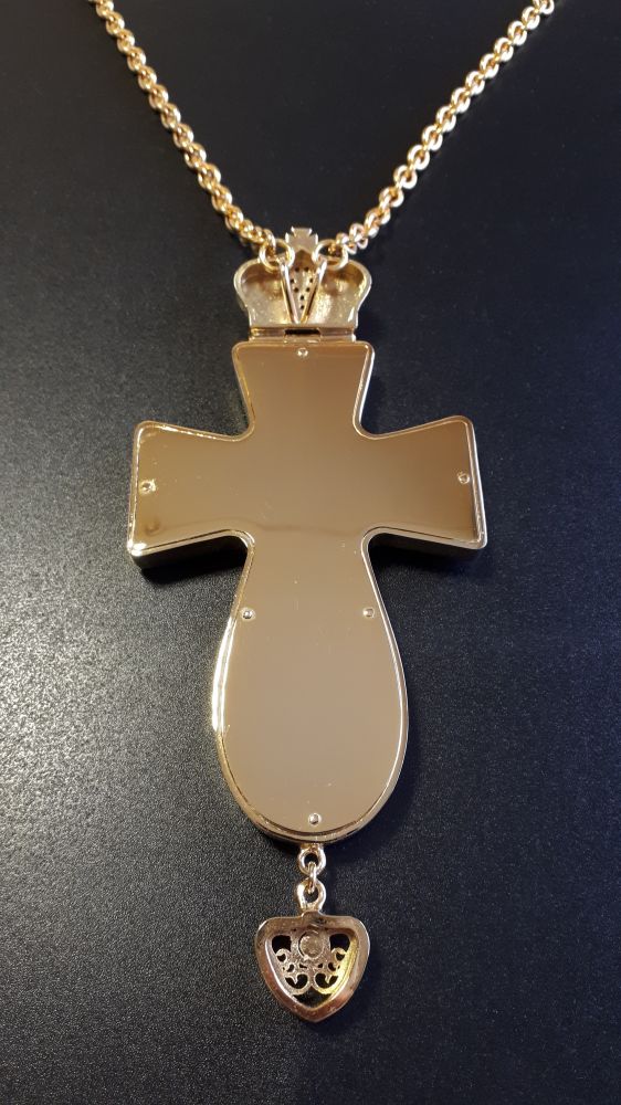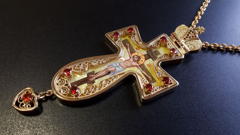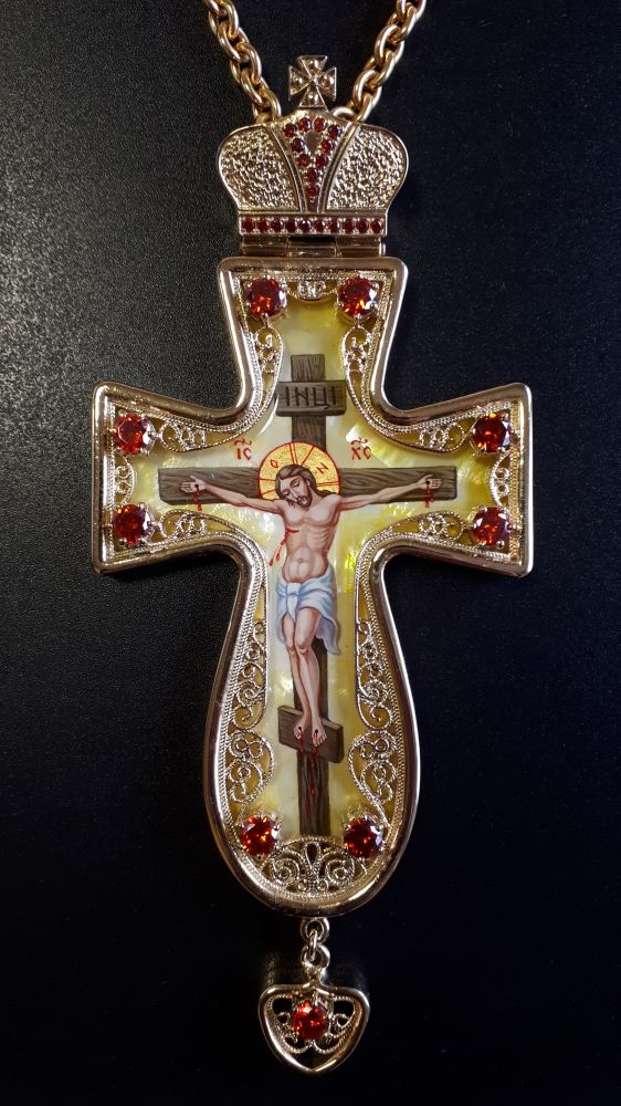 Хрест наперсний. Малюнок - ручний розпис на перламутрі. Розміри: 160х70 мм. Вага: 130 г. Позолочена латунь. Камені – цирконій. Ланцюг та футляр у комплекті. Можлива зміна кольору каміння, малюнка, виготовлення хреста у сріблі.