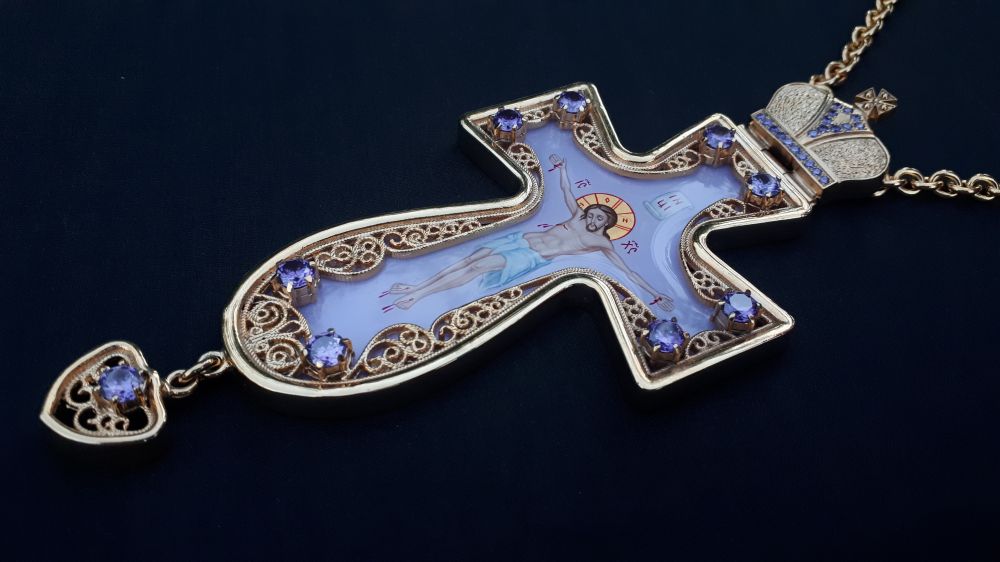Хрест наперсний. Малюнок - ручний розпис на перламутрі. Розміри: 160х70 мм. Вага: 130 г. Позолочена латунь. Камені – цирконій. Ланцюг та футляр у комплекті. Можлива зміна кольору каміння, малюнка, виготовлення хреста у сріблі.