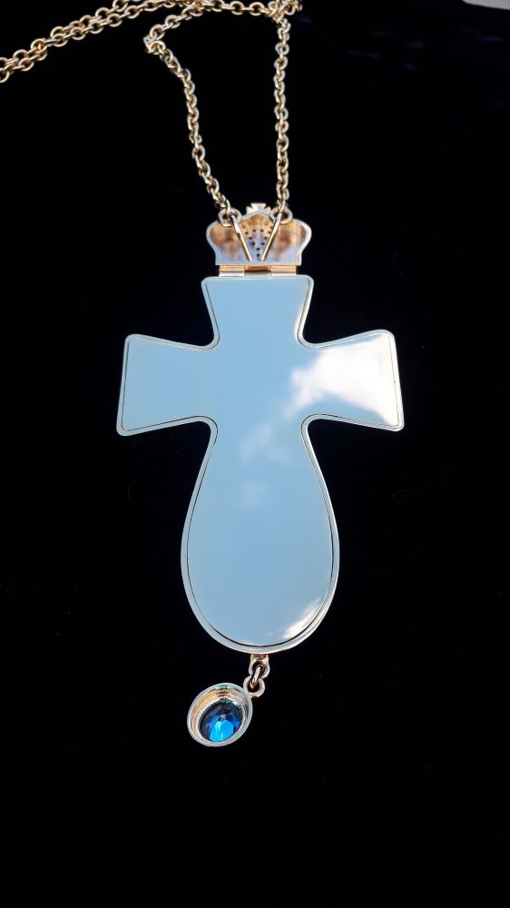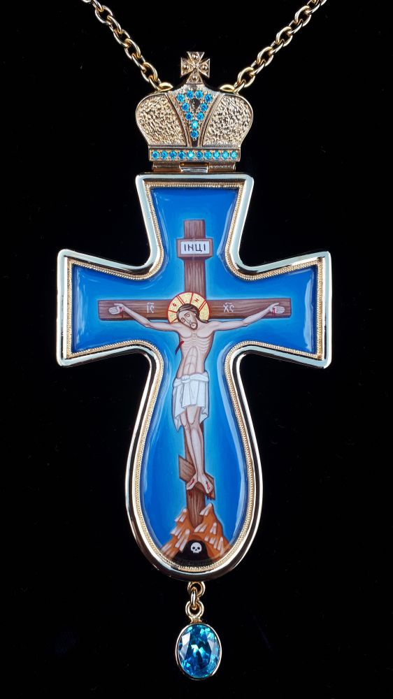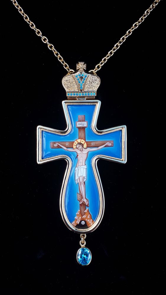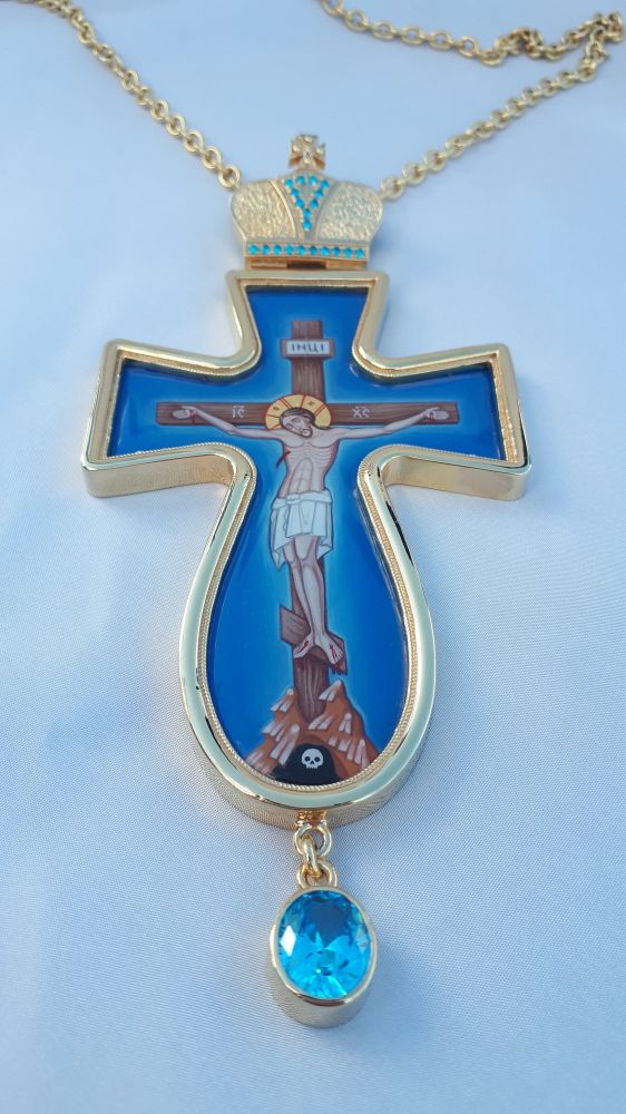 Хрест наперсний. Малюнок - ручний розпис на металі. Розміри: 160х70 мм. Вага: 130 г. Позолочена латунь. Камені – цирконій. Ланцюг та футляр у комплекті. Можлива зміна кольору каміння, малюнка, виготовлення хреста у сріблі.