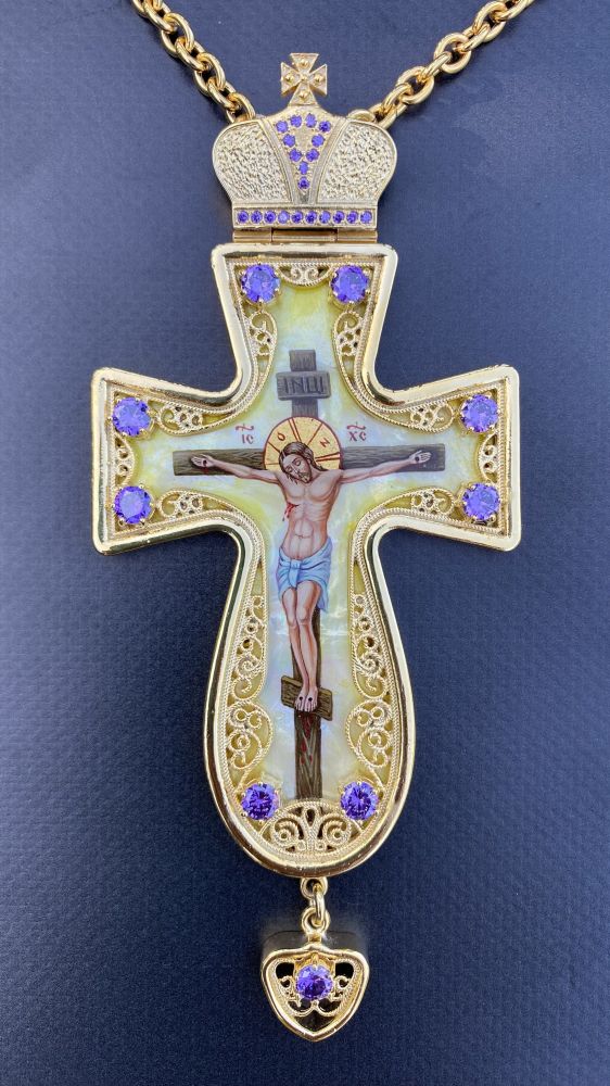 Крест наперсный. Рисунок - ручная роспись на перламутре. Размеры: 160х70 мм. Вес: 130 г. Золоченая латунь. Камни - цирконий. Цепь и футляр в комплекте. Возможно изменение цвета камней, рисунка, изготовление креста в серебре.