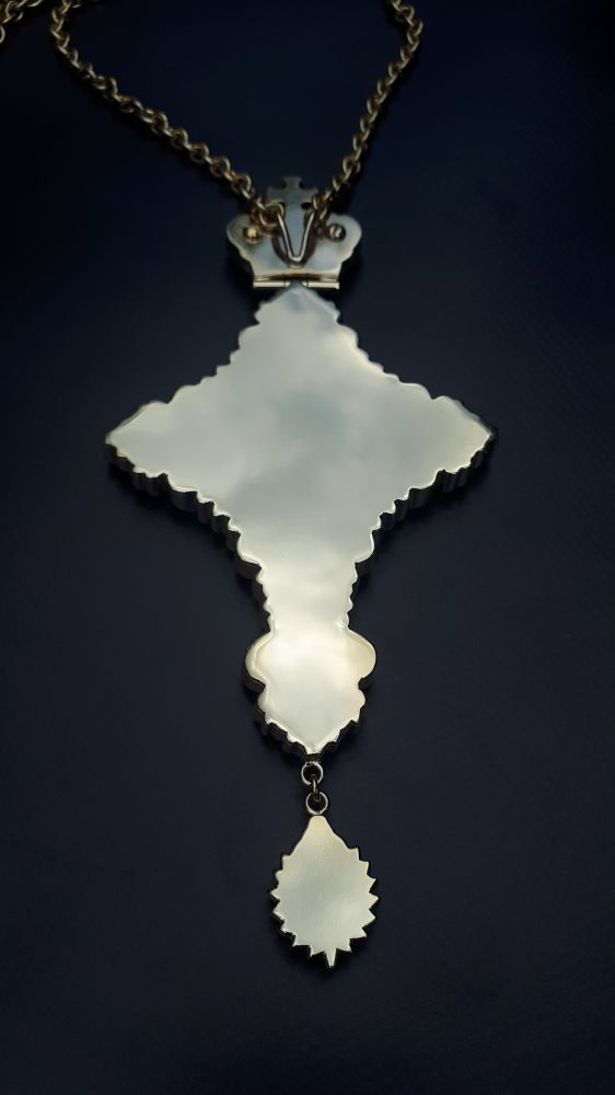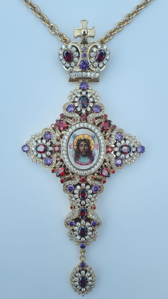 Крест наперсный. Рисунок - ручная роспись на перламутре. Размеры: 176х80 мм. Вес: 150 г. Золоченая латунь. Камни - цирконий. Цепь и футляр в комплекте. Возможно изменение цвета камней, рисунка, изготовление креста в серебре.