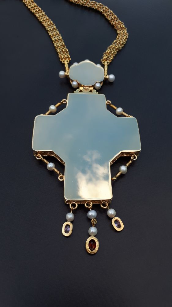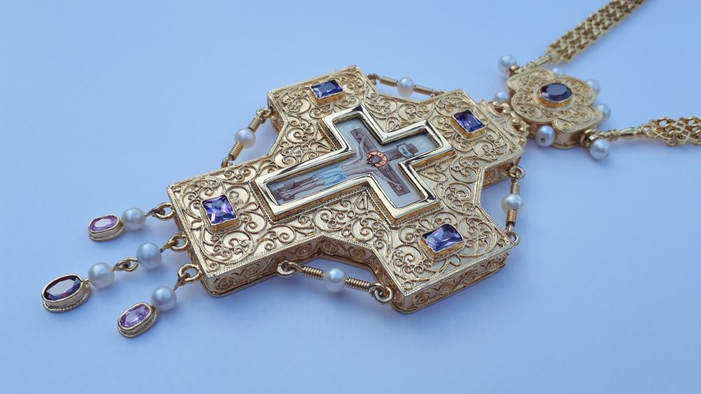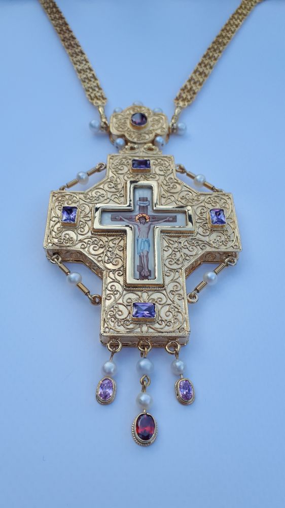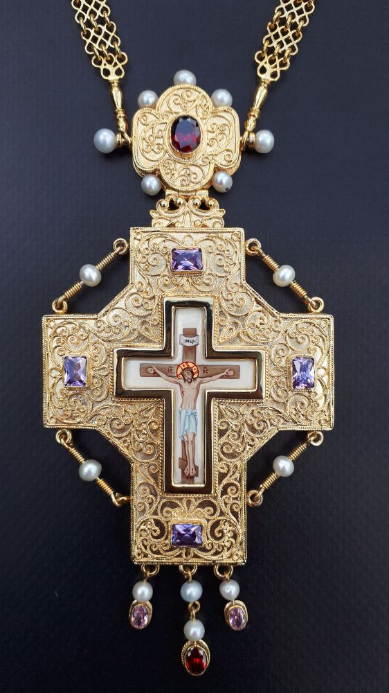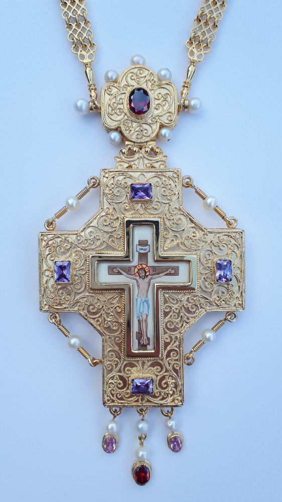 Хрест наперсний. Малюнок - ручний розпис на перламутрі. Розміри: 140х65 мм. Вага: 108 г. Позолочена латунь. Камені – цирконій. Натуральні перли. Ланцюг та футляр у комплекті. Можлива зміна кольору каміння, малюнка, виготовлення хреста у сріблі.