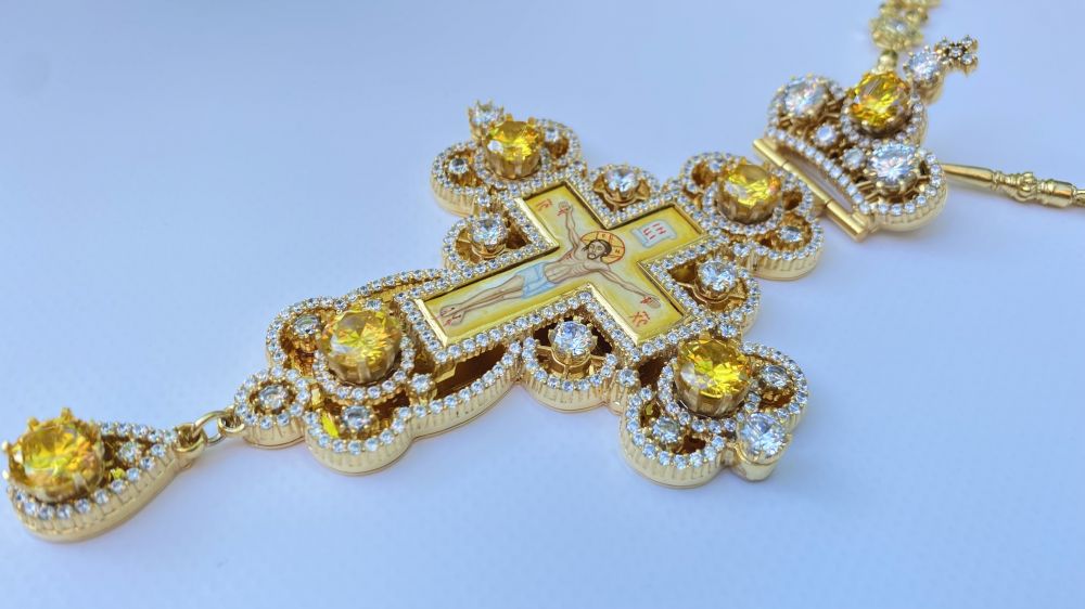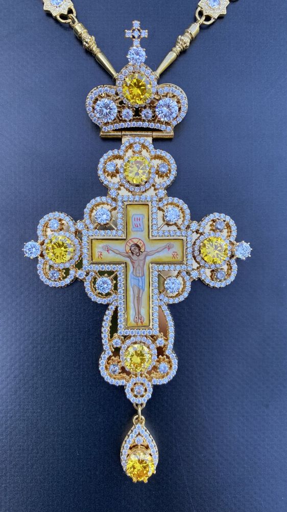 Хрест наперсний. Малюнок - ручний розпис на перламутрі. Розміри: 165х85 мм. Вага: 146 г. Позолочена латунь. Камені – цирконій. Ланцюг та футляр у комплекті. Можлива зміна кольору каміння, малюнка, виготовлення хреста у сріблі.