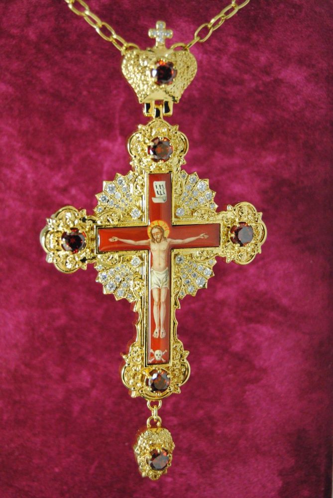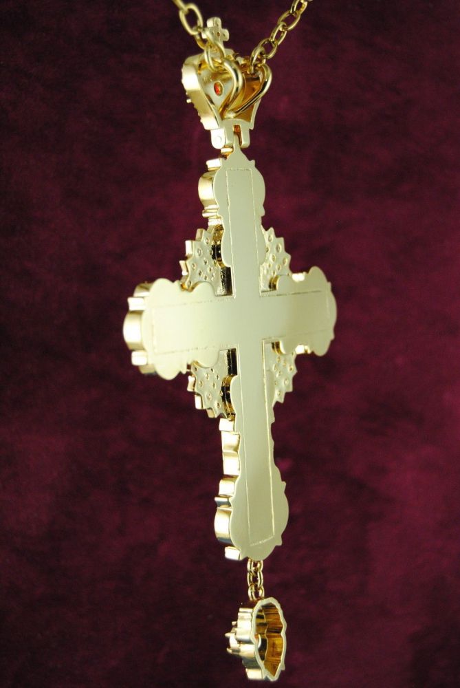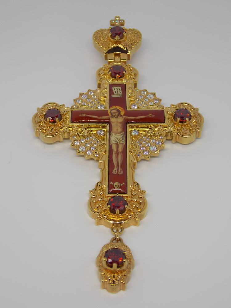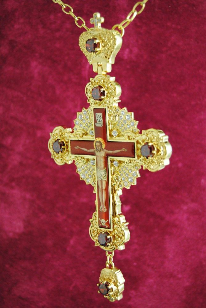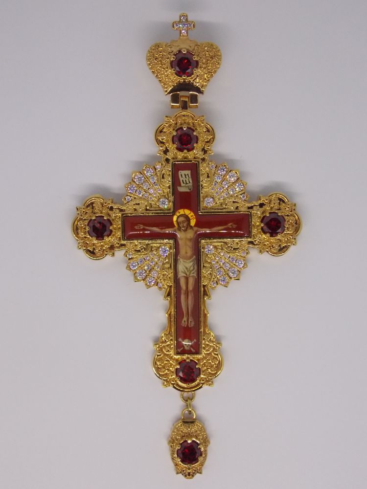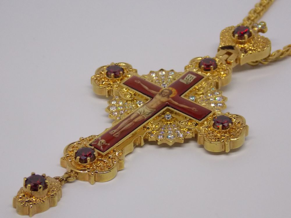 Хрест наперсний Розп'яття - ручний розпис на металі Розміри: 140х75 мм, Вага: 100 г Позолочена латунь. Камені – цирконій. Ланцюг та футляр у комплекті Можлива зміна кольору каміння, малюнка, виготовлення хреста у сріблі.
