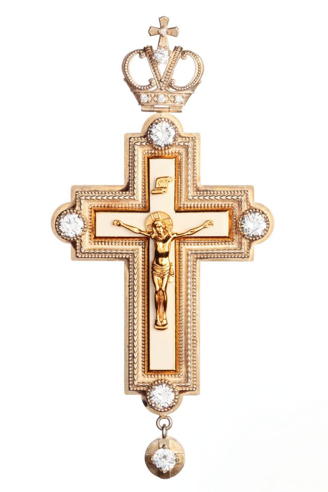 Хрест наперсний з білою емаллю Розміри: 190х90 мм Вага: 164 г Посріблена латунь з золоченими вставками. Камені – цирконій. Ланцюг та футляр у комплекті Можлива зміна кольору каміння, емалі, виготовлення хреста у сріблі.