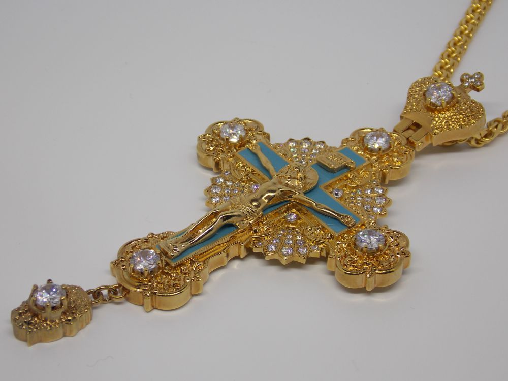 Крест наперсный. Литое распятие. Размеры: 140х75 мм. Вес: 100 г. Золоченая латунь. Камни - цирконий. Цепь и футляр в комплекте. Возможно изменение цвета камней, эмали, изготовление креста в серебре.Крест наперсный.