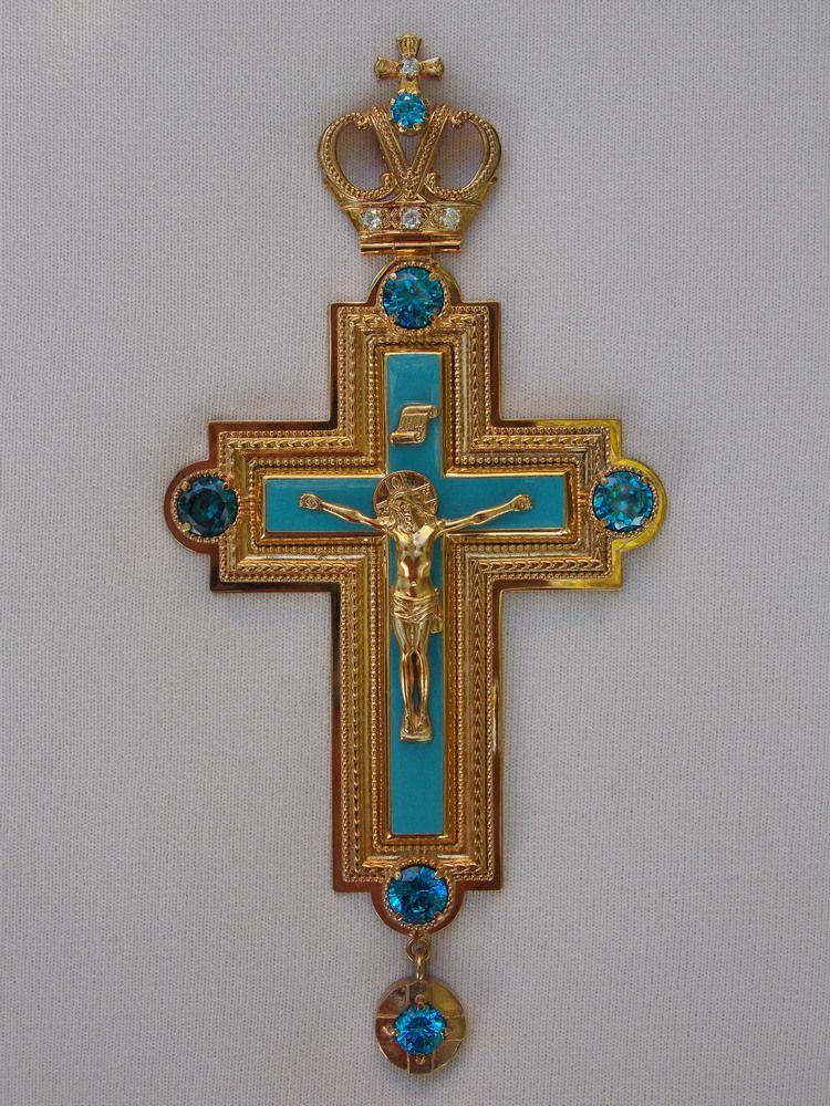 Хрест наперсний з голубою емаллю. Розміри: 190х90 мм. Вага: 164 г. Позолочена латунь. Камені – цирконій. Ланцюг та футляр у комплекті. Можлива зміна кольору каміння, емалі, виготовлення хреста у сріблі.