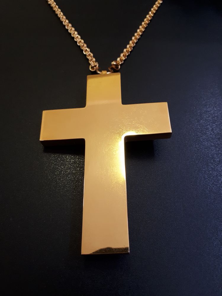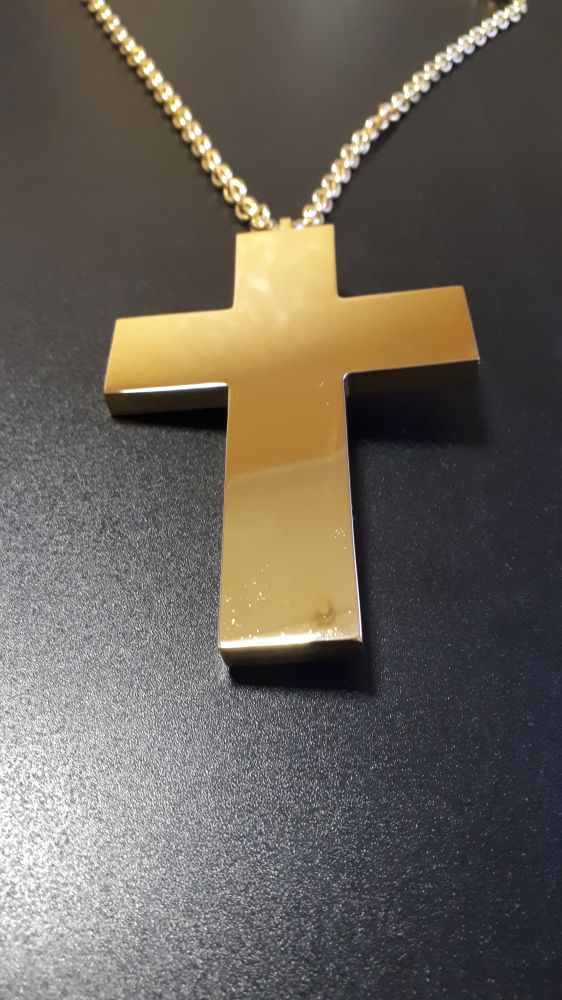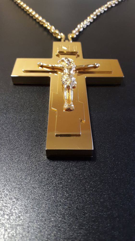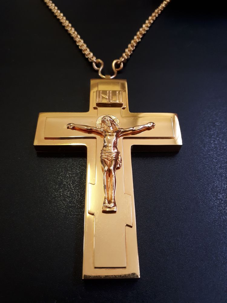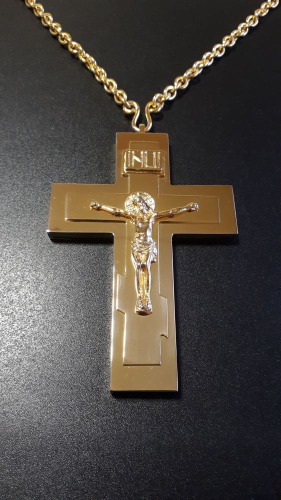 Хрест наперсний. Розміри: 100 х 65 мм. Вага: 85 г. Товщина: 5 мм. Позолочена латунь. Ланцюг та футляр у комплекті. Можливе виготовлення хреста у сріблі.