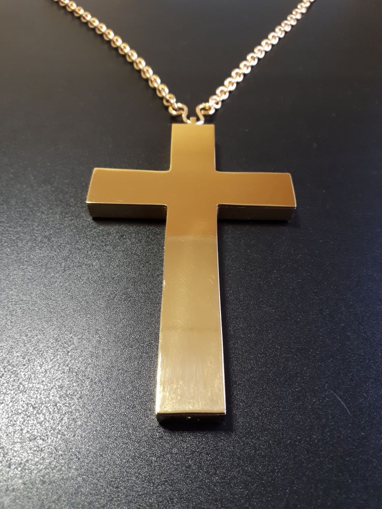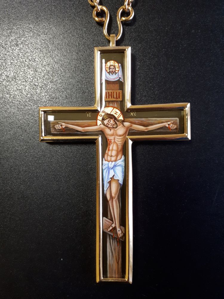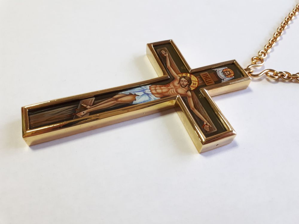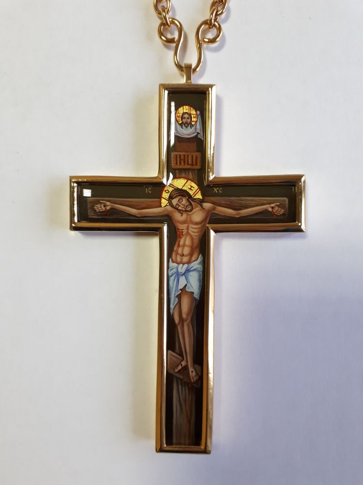 Крест наперсный. Распятие - ручная роспись на металле. Размеры: 110х70 мм. Вес: 60 г. Золоченая латунь. Цепь и футляр в комплекте. Возможно изготовление креста в серебре.