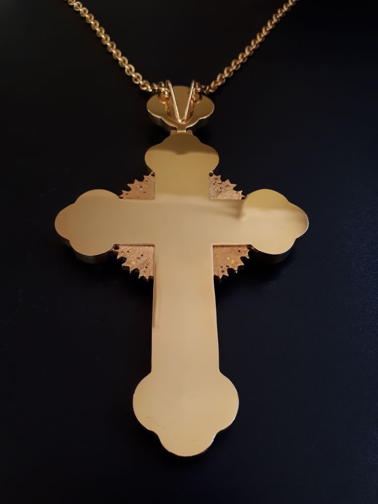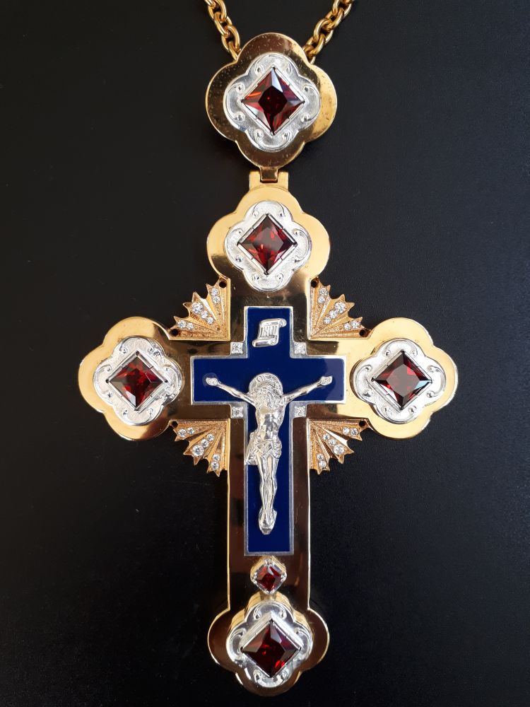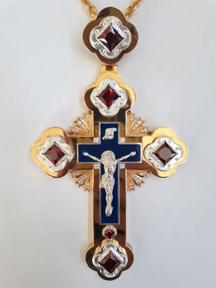 Хрест наперсний за мотивами Фаберже. Розміри: 160х90 мм. Вага: 158 г. Позолочена латунь. Фігурні накладки навколо великих каменів та розп'яття – посріблення. Камені – цирконій. Ланцюг та футляр у комплекті. Можлива зміна кольору каміння, виготовлення хреста у сріблі.