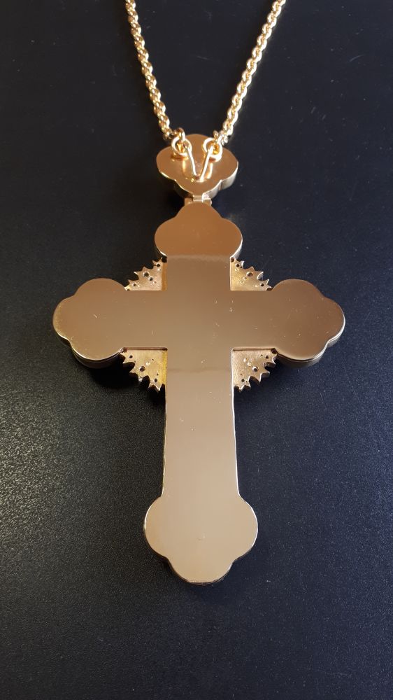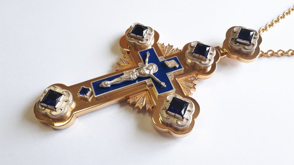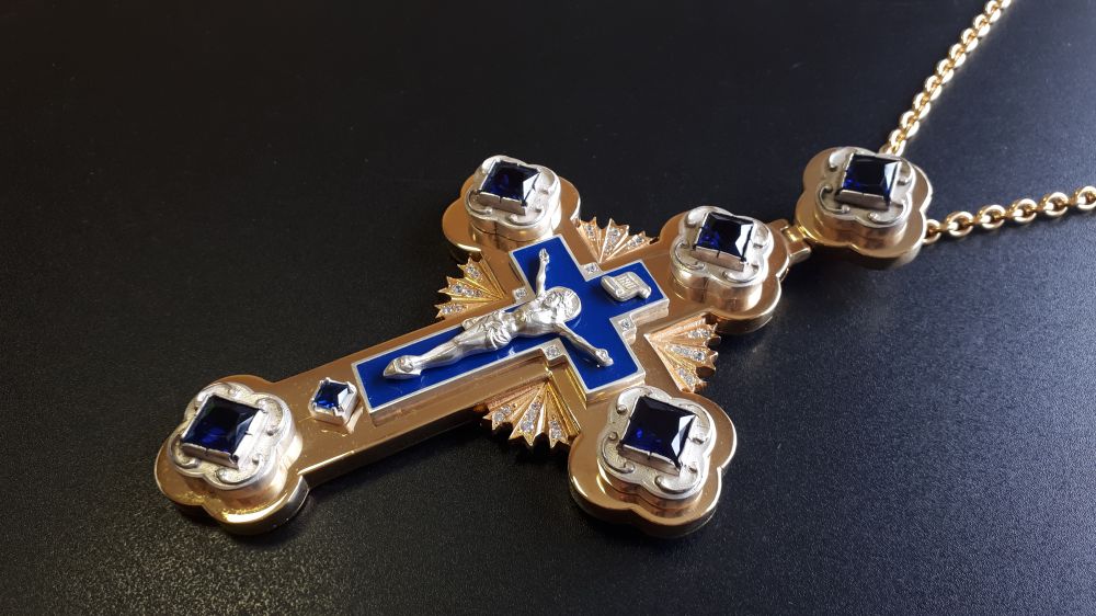 Хрест наперсний за мотивами Фаберже. Розміри: 160х90 мм. Вага: 158 г. Позолочена латунь. Фігурні накладки навколо великих каменів та розп'яття – посріблення. Камені – цирконій. Ланцюг та футляр у комплекті. Можлива зміна кольору каміння, виготовлення хреста у сріблі.