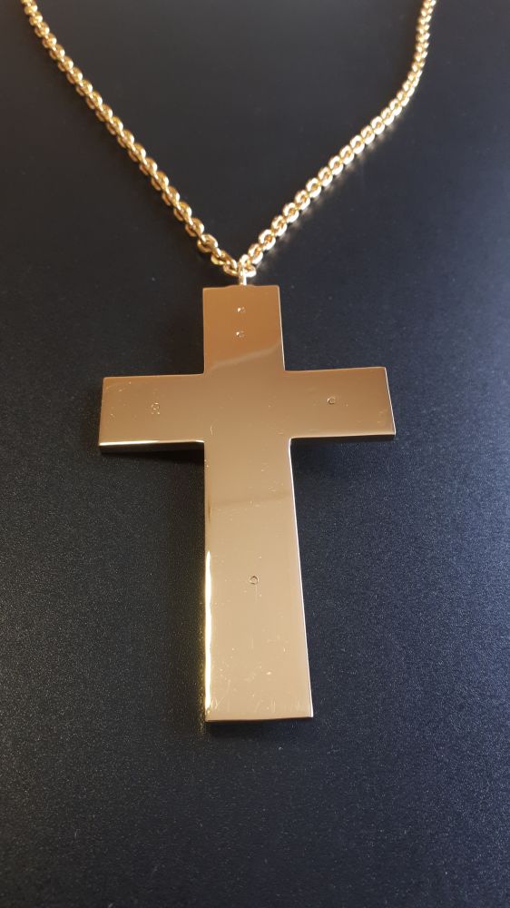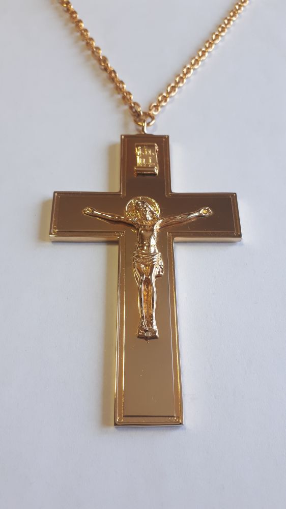 Хрест наперсний. Розміри: 92 х 57 мм. Вага: 60 г. Товщина латунної пластини: 3 мм. Позолочена латунь. Ланцюг та футляр у комплекті. Можливе виготовлення хреста у сріблі.