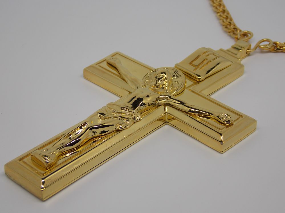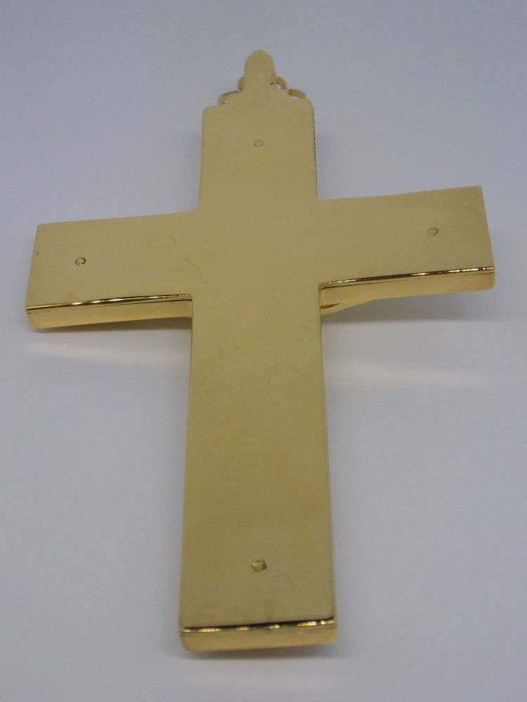 Хрест протоієрейський. Лите розп'яття. Розміри: 130х75 мм. Вага: 135 г. Позолочена латунь. Ланцюг та футляр у комплекті. Можливе виготовлення хреста у сріблі.