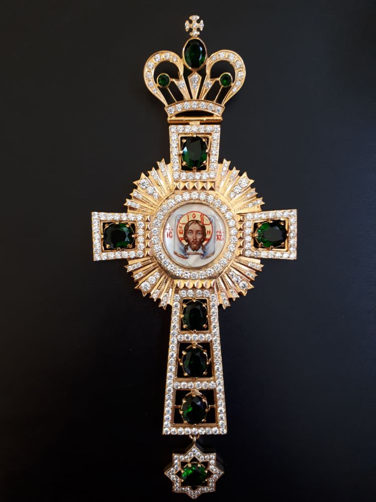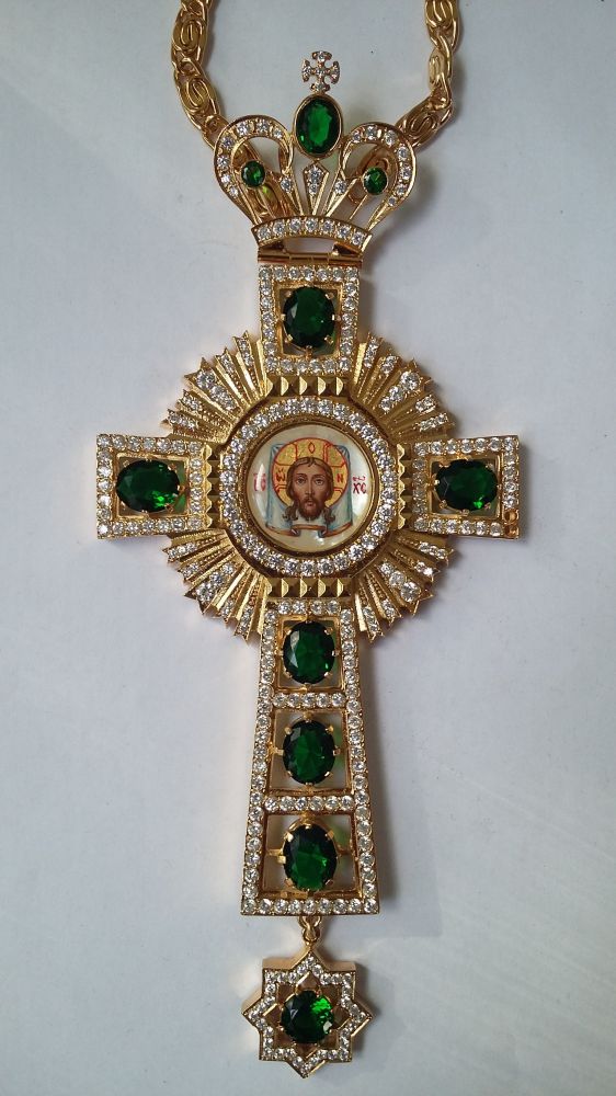 Хрест наперсний. Підвіска – Віфліємська зірка. Лик - ручний розпис на перламутрі. Розміри: 190х80 мм. Вага: 120 г. Позолочена латунь. Камені – цирконій. Ланцюг та футляр у комплекті. Можлива зміна кольору каміння, малюнка, виготовлення хреста у сріблі.