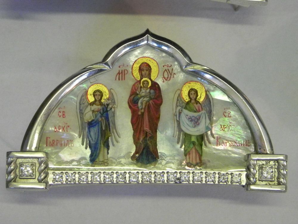 Накладка на митру. Рамка – посріблена латунь. Камені – цирконій. Іконка – ручний розпис на перламутрі, вкритий прозорою емаллю. Можлива зміна іконки, золочення рамки, зміна кольору каміння, виготовлення комплекту накладок в однакових рамках з різними іконками на вибір.