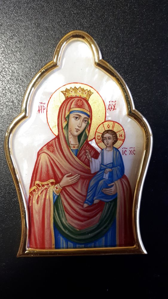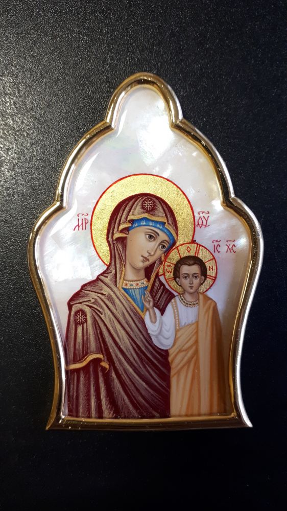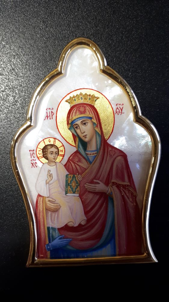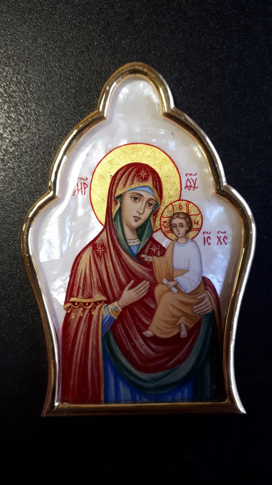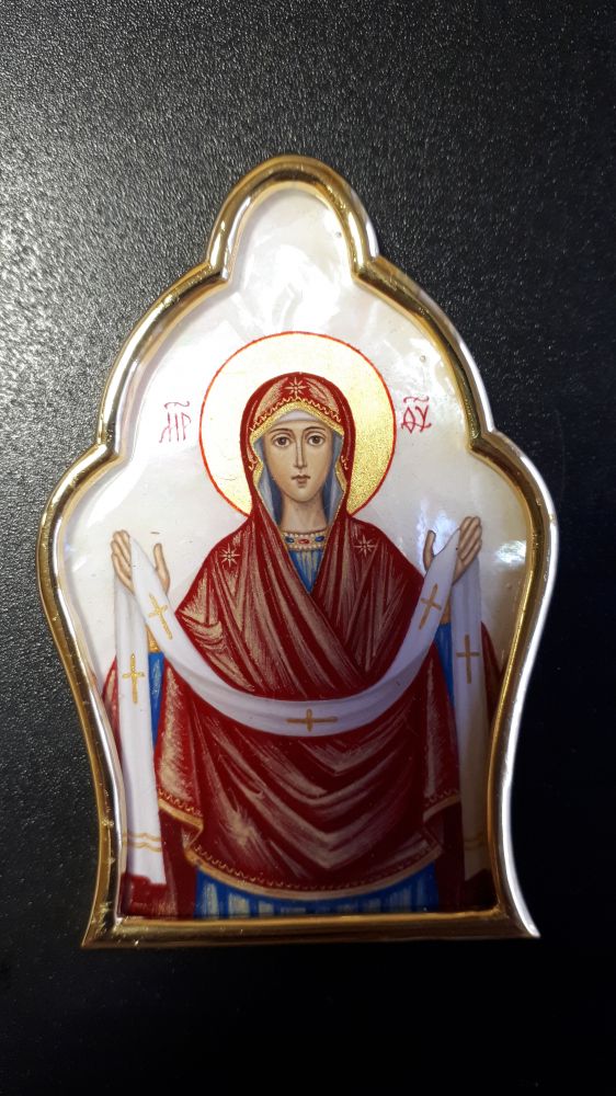 Накладка на митру. Рамка - золочёная латунь. Рисунок - ручная роспись на перламутре, покрытая прозрачной эмалью. Возможно изменение рисунка, серебрение рамок, изготовление комплекта накладок в одинаковых рамках с различными рисунками на выбор.