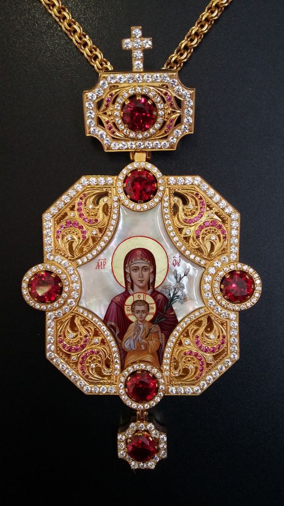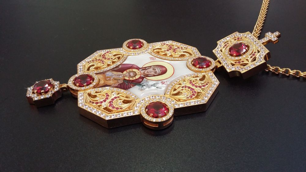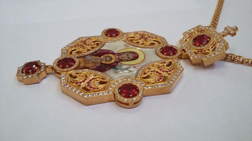 Панагія Малюнок - ручний розпис на перламутрі. Позолочена латунь. Камені – цирконій. Розміри: 173 х 95 мм. Вага: 219 г. Ланцюг і футляр у комплекті. Можлива зміна кольору каміння, малюнка, виготовлення іншого ланцюга на замовлення. Можливе виготовлення панагії та ланцюга зі срібла. Ціна панагії з ланцюгом у сріблі обговорюється окремо.
