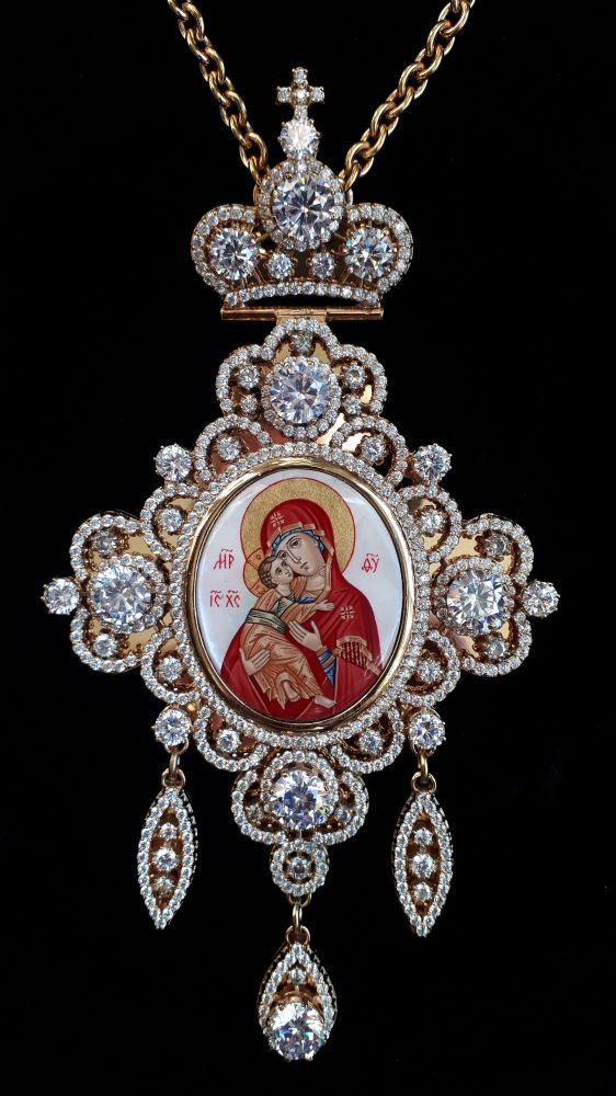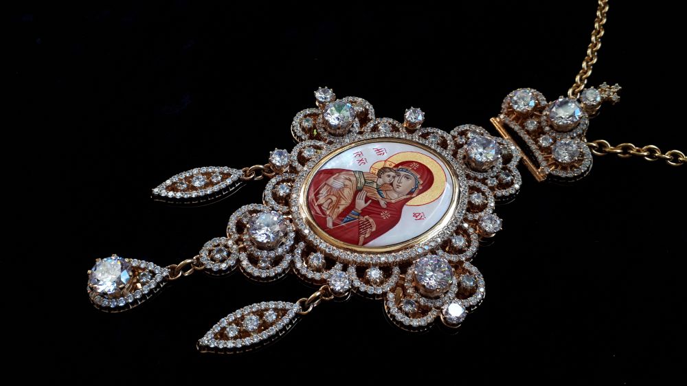 Панагія Малюнок - ручний розпис на перламутрі. Розміри: 168х90 мм. Вага: 172 г. Позолочена латунь. Камені – цирконій. Ланцюг та футляр у комплекті. Можлива зміна кольору каміння, малюнка, виготовлення іншого ланцюга на замовлення. Можливе виготовлення панагії та ланцюга зі срібла. Ціна панагії з ланцюгом у сріблі обговорюється окремо.