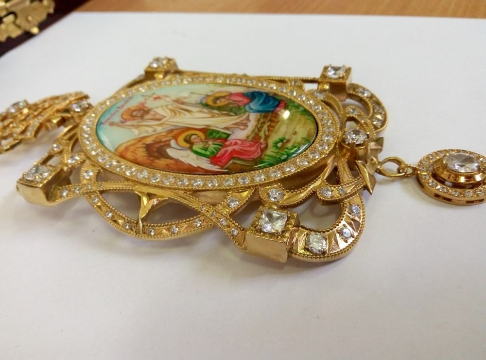 Панагія. Малюнок - ручний розпис на перламутрі. Розміри: 180х90 мм. Вага: 200 г. Позолочена латунь. Камені – цирконій. Ланцюг та футляр у комплекті. Можлива зміна кольору каміння, малюнка, виготовлення панагії у сріблі.